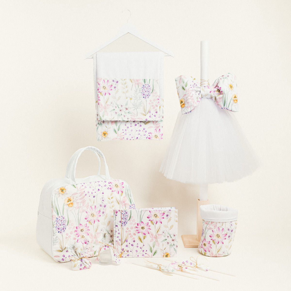 Ένα κομψό και ρομαντικό σετ βάπτισης με λουλούδια σε λιλά αποχρώσεις, ιδανικό για μια βάπτιση γεμάτη αθωότητα και φυσική ομορφιά.
