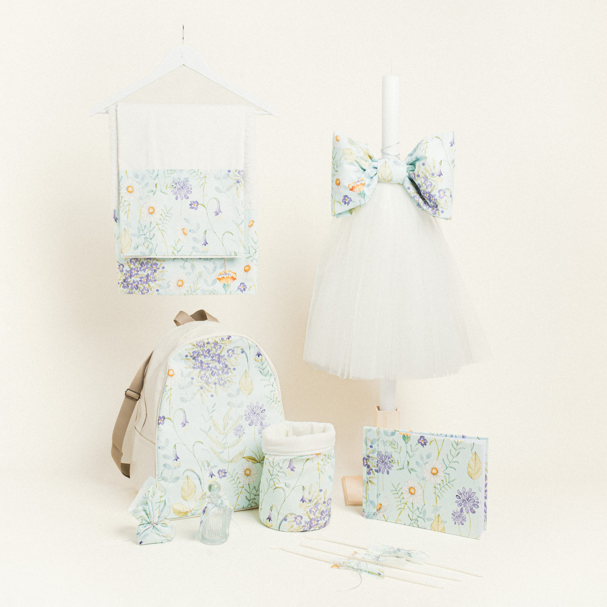 Ένα όμορφο και κομψό σετ βάπτισης με λουλούδια σε βεραμάν φόντο, ιδανικό για μια βάπτιση γεμάτη φρεσκάδα και γλυκύτητα.