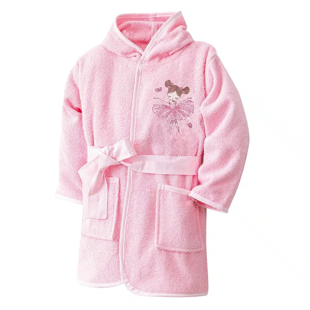 Μπουρνούζι βρεφικό/παιδικό με κουκούλα, κέντημα και ροζ ρέλι περιμετρικά, στις τσέπες, τη ζώνη και τα μανίκια, από ύφασμα φροτέ πενιέ, 100% βαμβακερό, μονόχρωμο, ροζ, σχέδιο μπαλαρίνα.