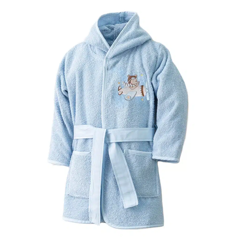 Μπουρνούζι βρεφικό/παιδικό με κουκούλα, κέντημα και σιέλ ρέλι περιμετρικά, στις τσέπες, τη ζώνη και τα μανίκια, από ύφασμα φροτέ πενιέ, 100% βαμβακερό, μονόχρωμο, σιέλ, σχέδιο πιλότος.