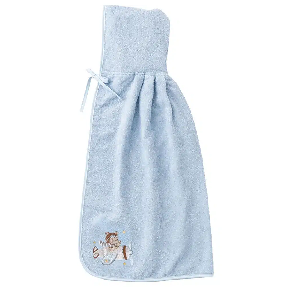Μπουρνουζοπετσέτα βρεφική με κουκούλα, κέντημα και σιέλ ρέλι περιμετρικά, από ύφασμα φροτέ πενιέ, 100% βαμβακερό, μονόχρωμο, σιέλ, σχέδιο πιλότος.