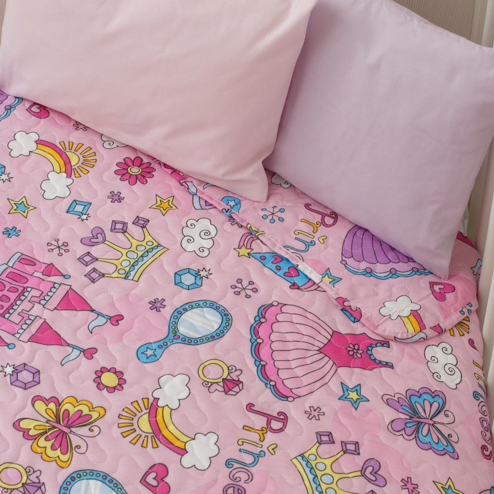 Κουβερλί κούνιας από ύφασμα microfiber, 100% πολυέστερ, εμπριμέ, με πριγκιπικά στοιχεία, με γραμμικό πολύγαζο σχέδιο.
