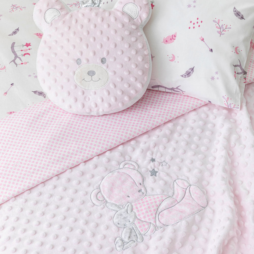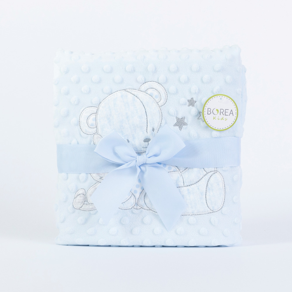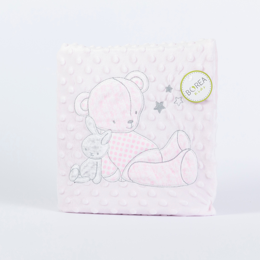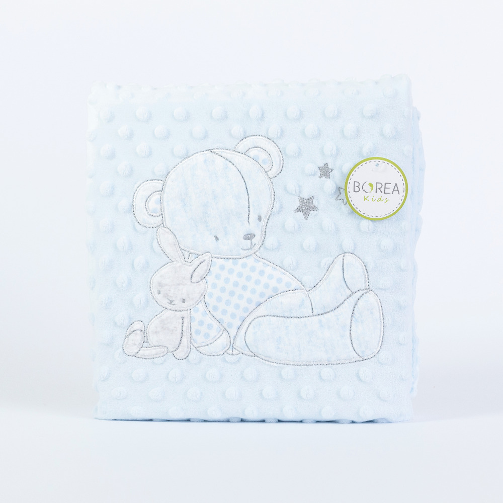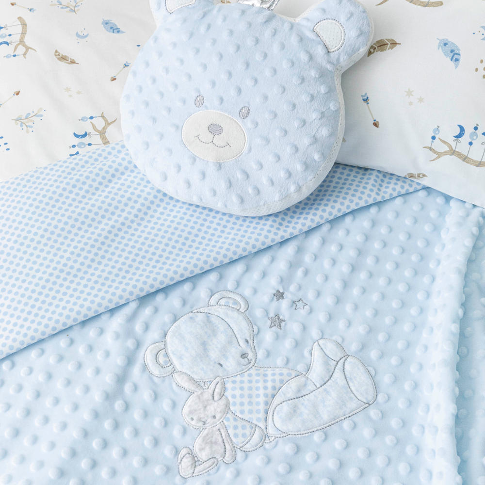 Κουβέρτα κούνιας από ύφασμα micromink, μονόχρωμο, ανάγλυφο, με φούσκες, κέντημα και διακοσμητική φάσα περιμετρικά στην μπροστινή όψη από ύφασμα εμπριμέ,jersey ίδιο με την πίσω όψη, 100% πολυέστερ. Διατίθεται σε 2 χρώματα.