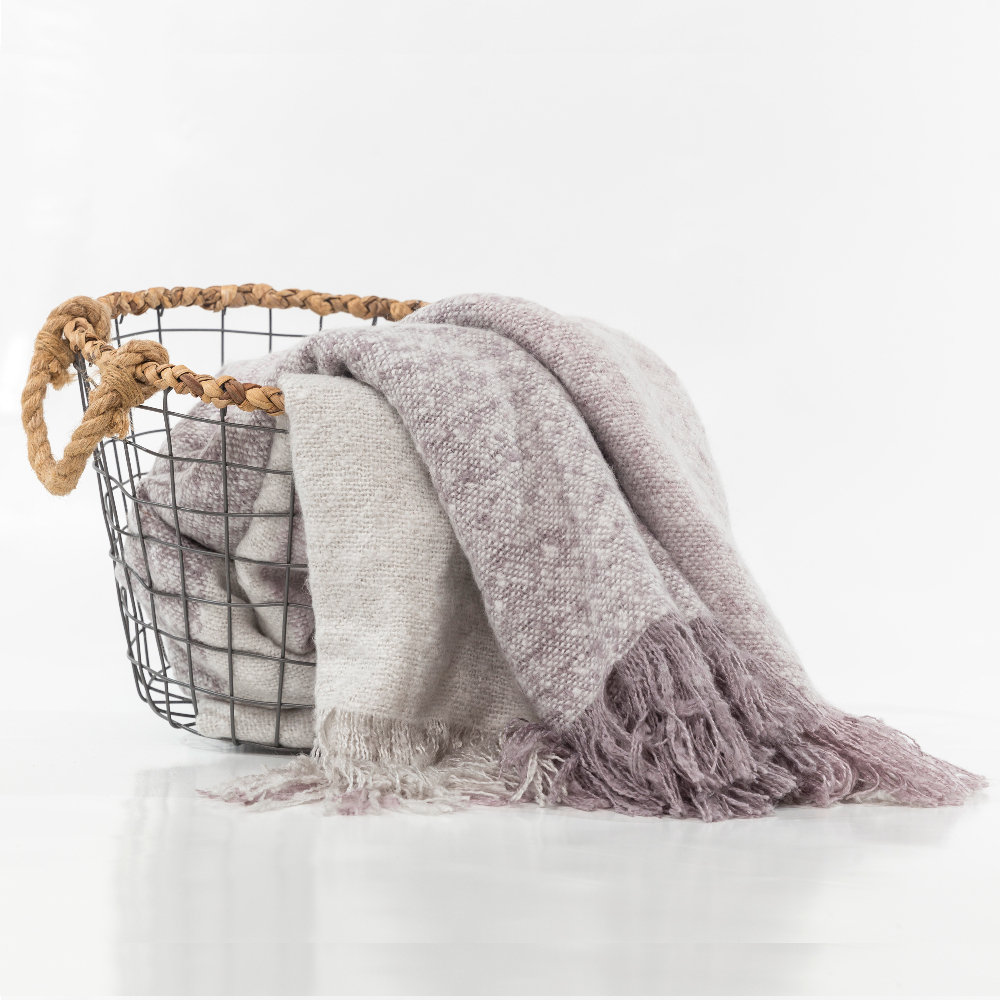Κουβέρτα καναπέ με κρόσσια, μοχέρ, 100% ακρυλική, σε χρώματα λιλά-γκρί και εκρού-καφέ.