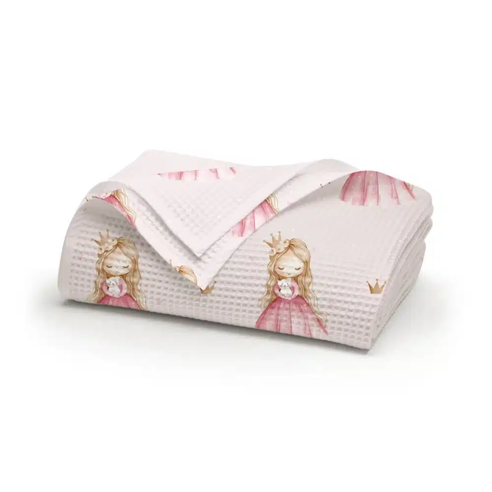 Κουβέρτα κούνιας από ύφασμα πικέ waffle, 80% βαμβάκι-20% viscose, εμπριμέ, ροζ, σχέδιο πριγκίπισσα. Διατίθεται σε 2 χρώματα.