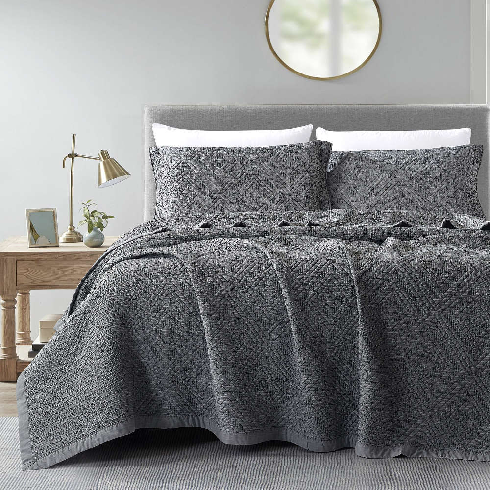 Σετ κουβέρτα καλοκαιρινή πολυτελείας υπέρδιπλη με μαξιλαροθήκες oxford style από ύφασμα ζακάρ πετροπλυμένο, 100% πολυέστερ, με γραμμικό σχέδιο και μόνοχρωμη φάσα, σχέδιο carrara, χρώμα ανθρακί.