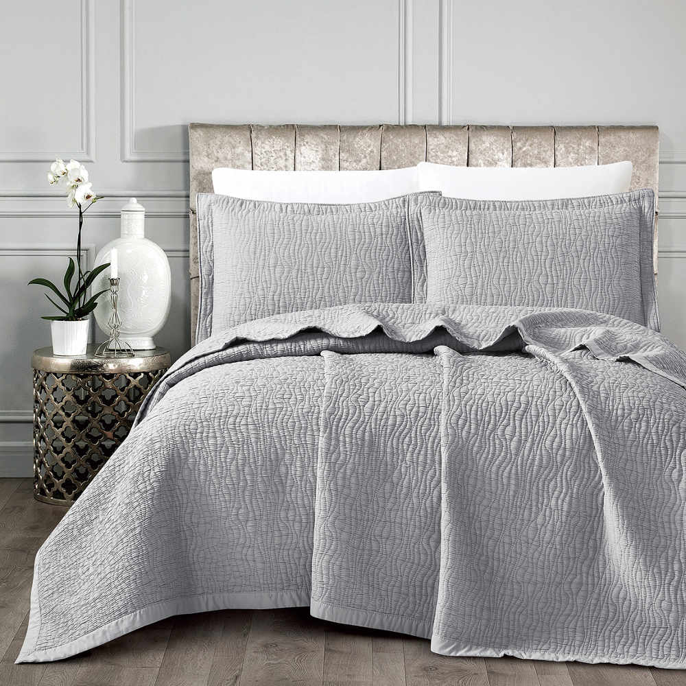 Σετ κουβέρτα καλοκαιρινή πολυτελείας υπέρδιπλη με μαξιλαροθήκες oxford style από ύφασμα ζακάρ, 100% πολυέστερ, με γραμμικό σχέδιο και μονόχρωμη φάσα, σχέδιο νερά, χρώμα γκρι.