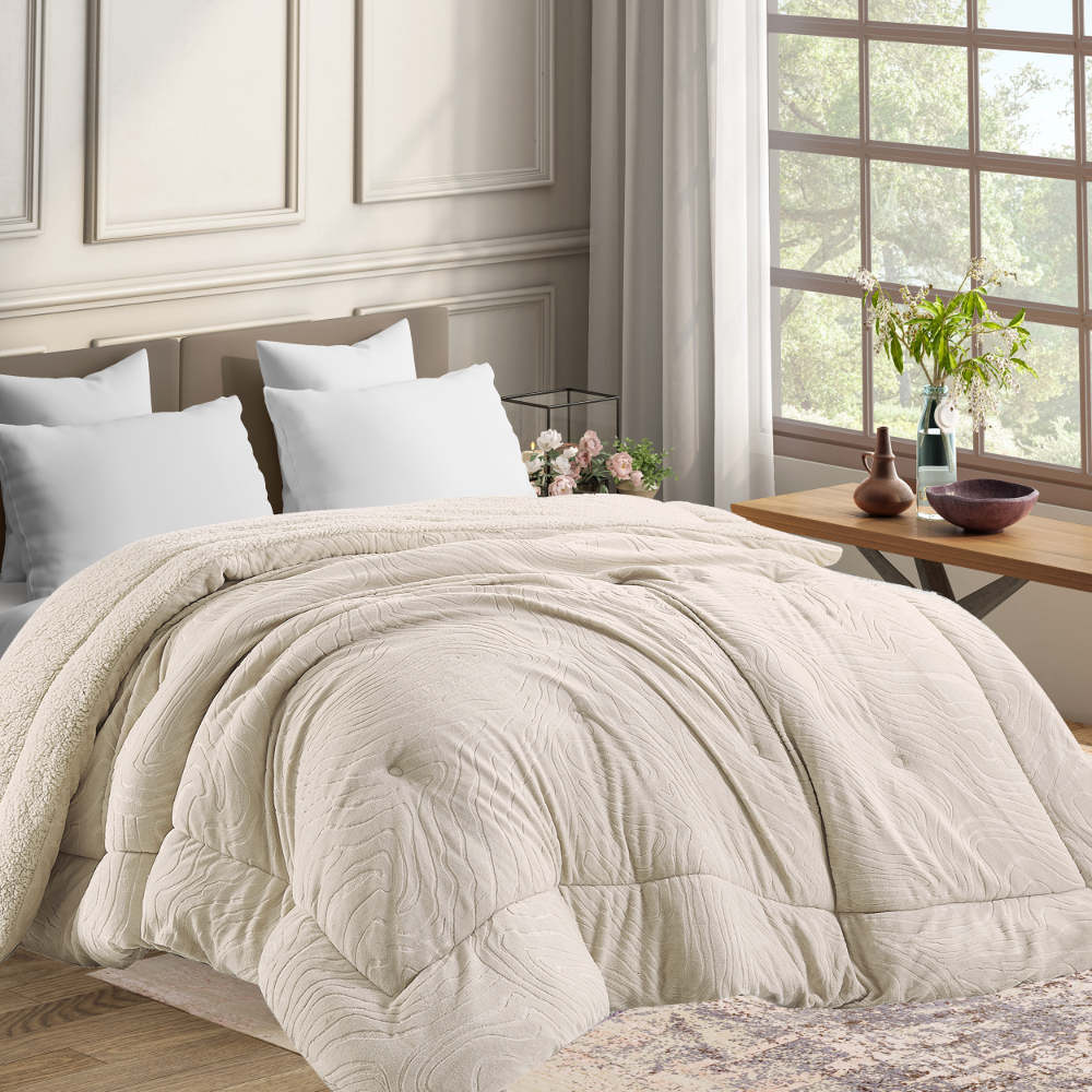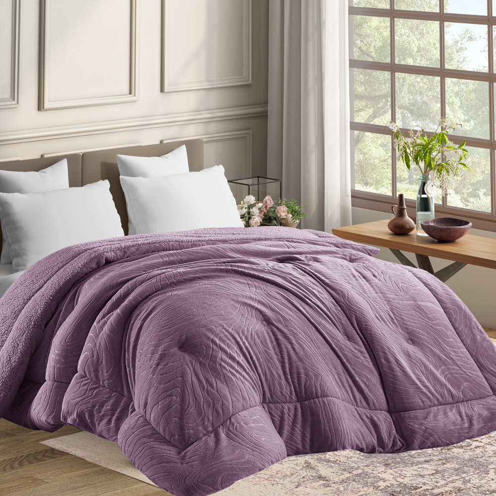 Κουβερτοπάπλωμα υπέρδιπλο φλάνελ, 100% πολυέστερ, μονόχρωμο, με ανάγλυφο σχέδιο και επένδυση προβατάκι sherpa.