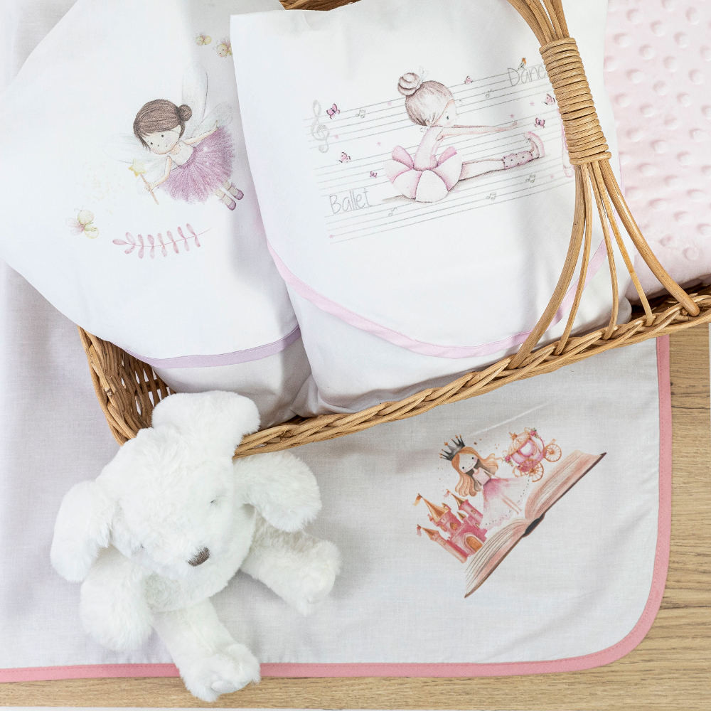 Πάνα αγκαλιάς από ύφασμα φανέλα, 100 % βαμβακερό, λευκό με ροζ ρέλι περιμετρικά και ψηφιακή εκτύπωση τριών σχεδίων για κορίτσι.