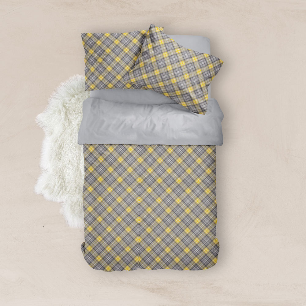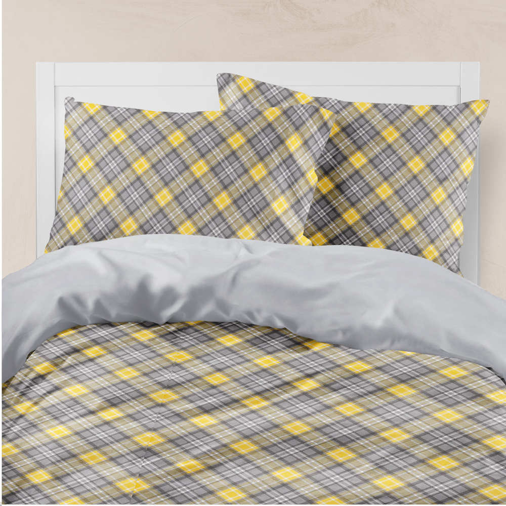 Σετ παπλωματοθήκη με φερμουάρ υπέρδιπλη με μαξιλαροθήκες από ύφασμα μερσεριζέ, 160 κλωστών, 100% βαμβακερό, συνδυασμός εμπριμέ καρώ μοτίβου και μονοχρωμίας, σε χρώμα γκρι.