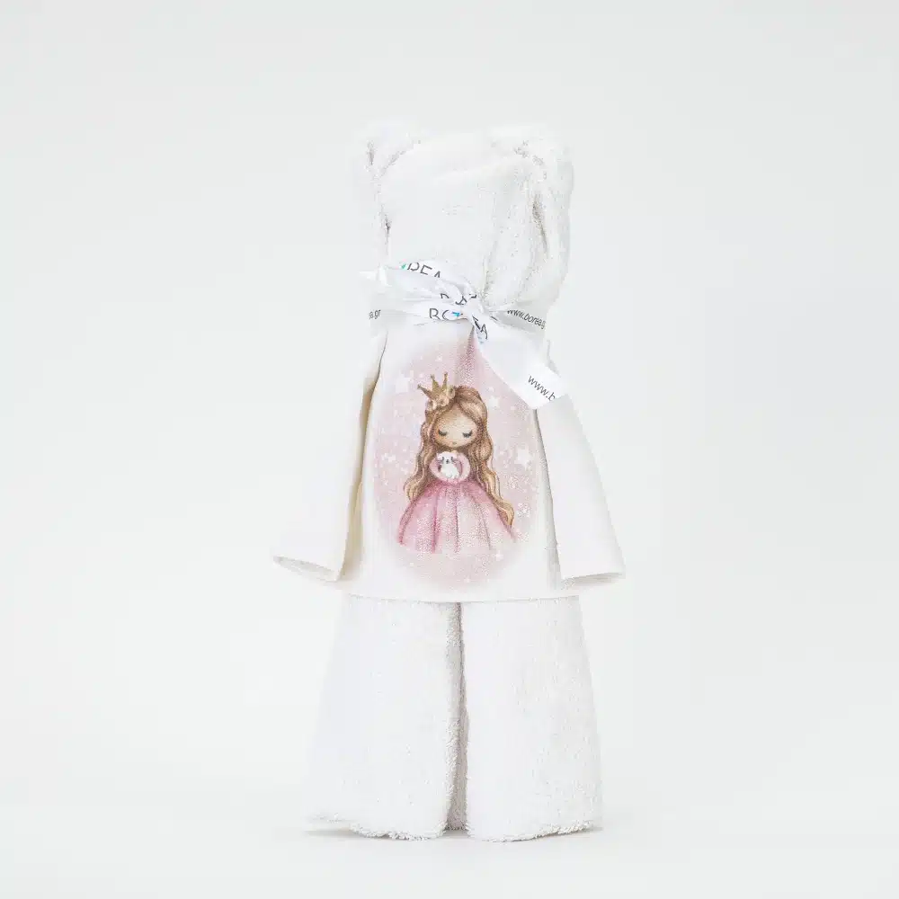 Πετσέτα προσώπου, από ύφασμα φροτέ πενιέ, 100% βαμβακερό, μονόχρωμο, με ψηφιακή εκτύπωση, σχέδιο πριγκίπισσα, σε συσκευασία/σχήμα αρκουδάκι.Διατίθεται σε 2 χρώματα.