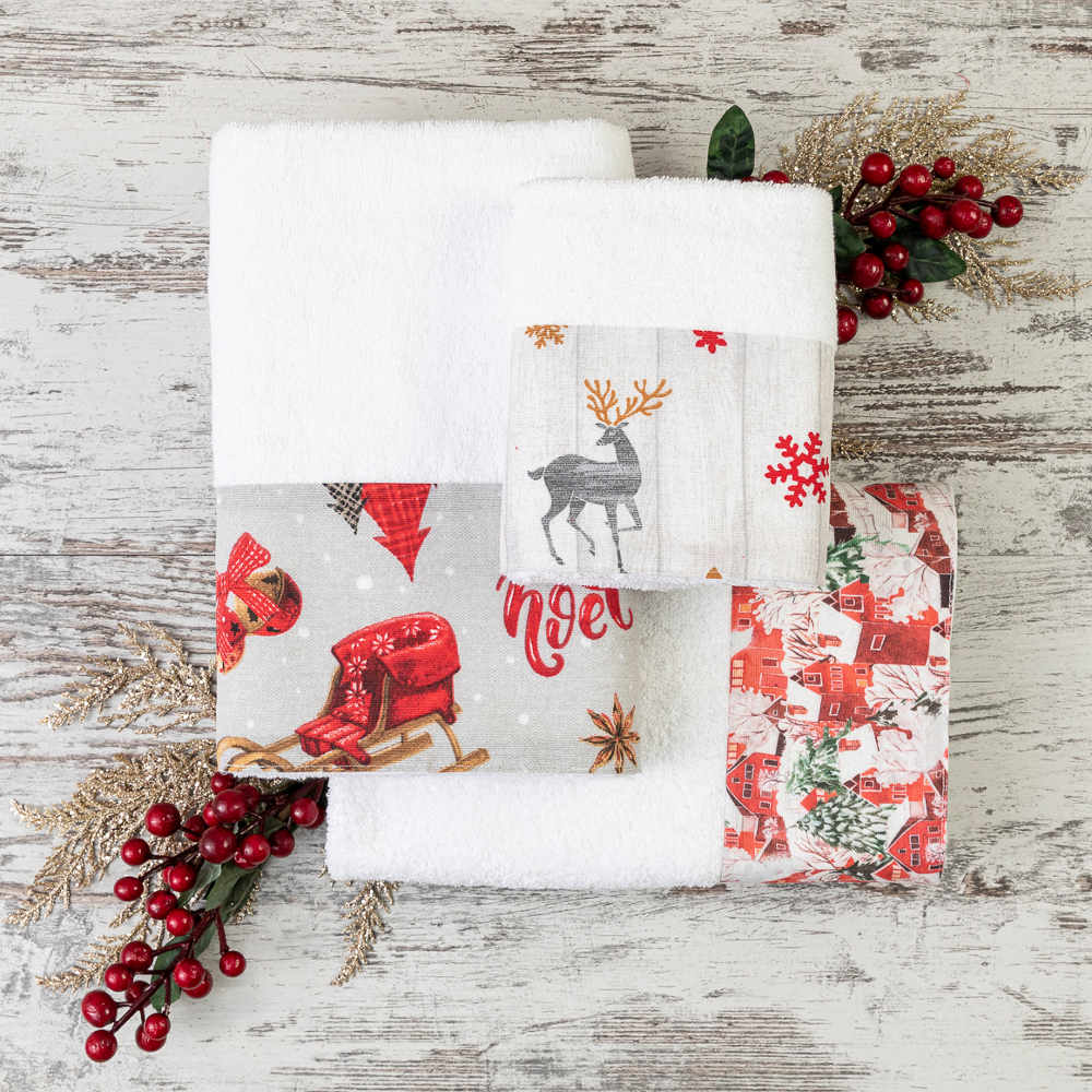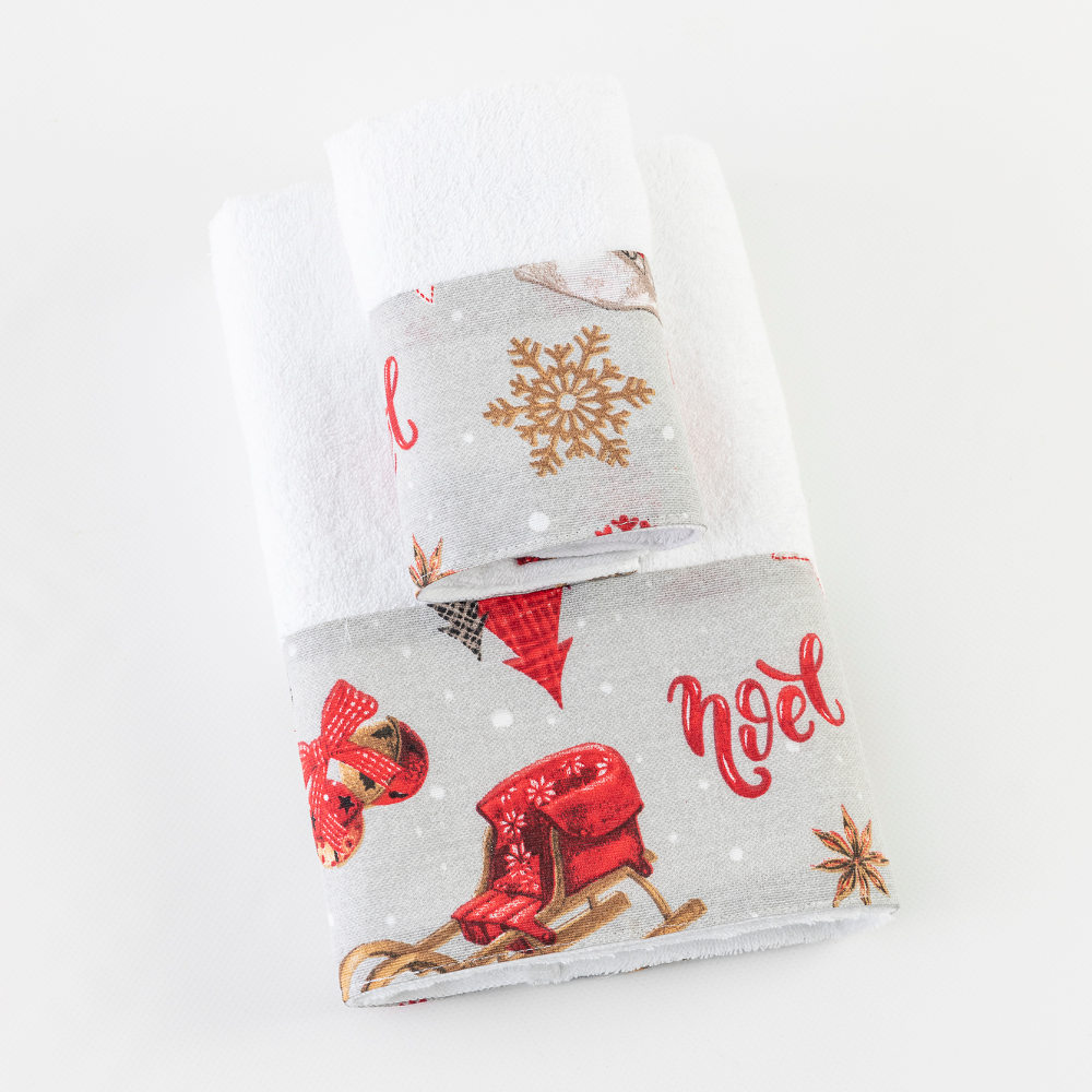 Σετ πετσέτες 2 τεμαχίων, προσώπου και χειρός, από ύφασμα φροτέ, πενιέ, 100% βαμβακερό, με διακοσμητική χριστουγεννιάτικη φάσα ύφασμα.
