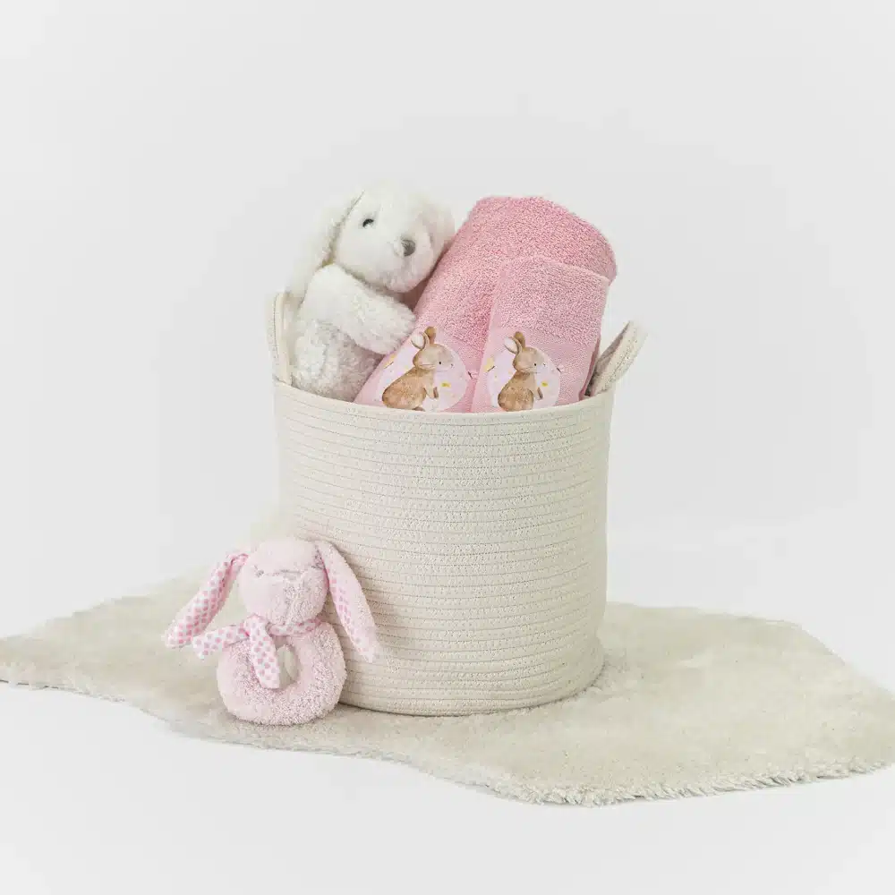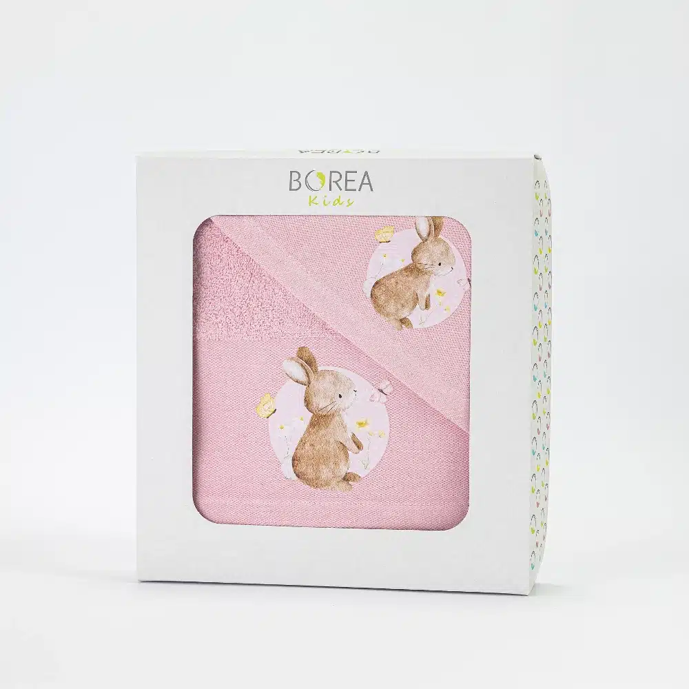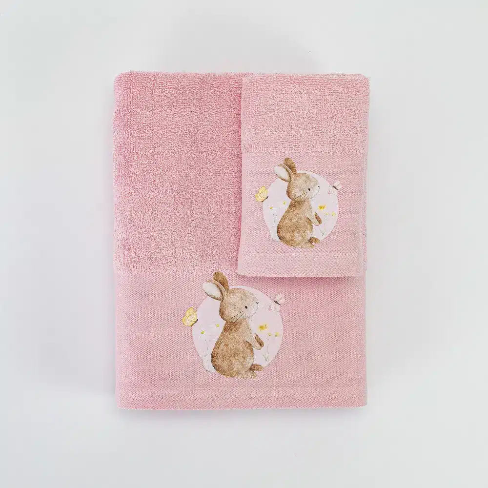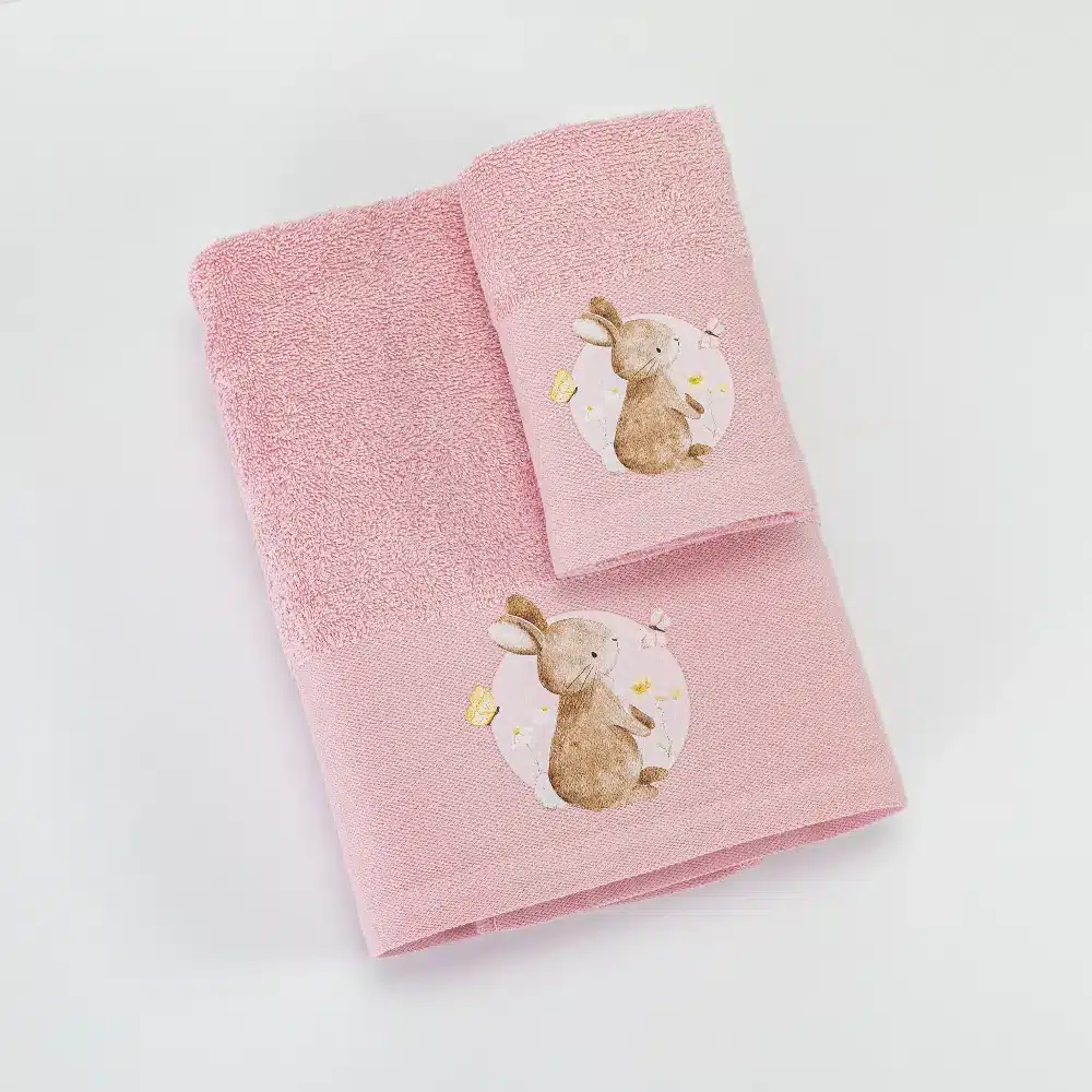 Σετ πετσέτες 2 τεμαχίων, μπάνιου και χειρός, από ύφασμα φροτέ πενιέ, 100% βαμβακερό, μονόχρωμο, ροζ, με απλικέ, σχέδιο λαγουδάκι. Διατίθεται σε 2 χρώματα.