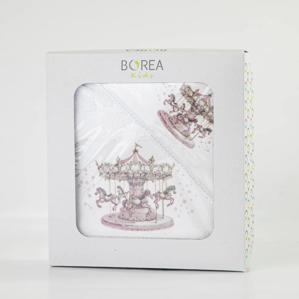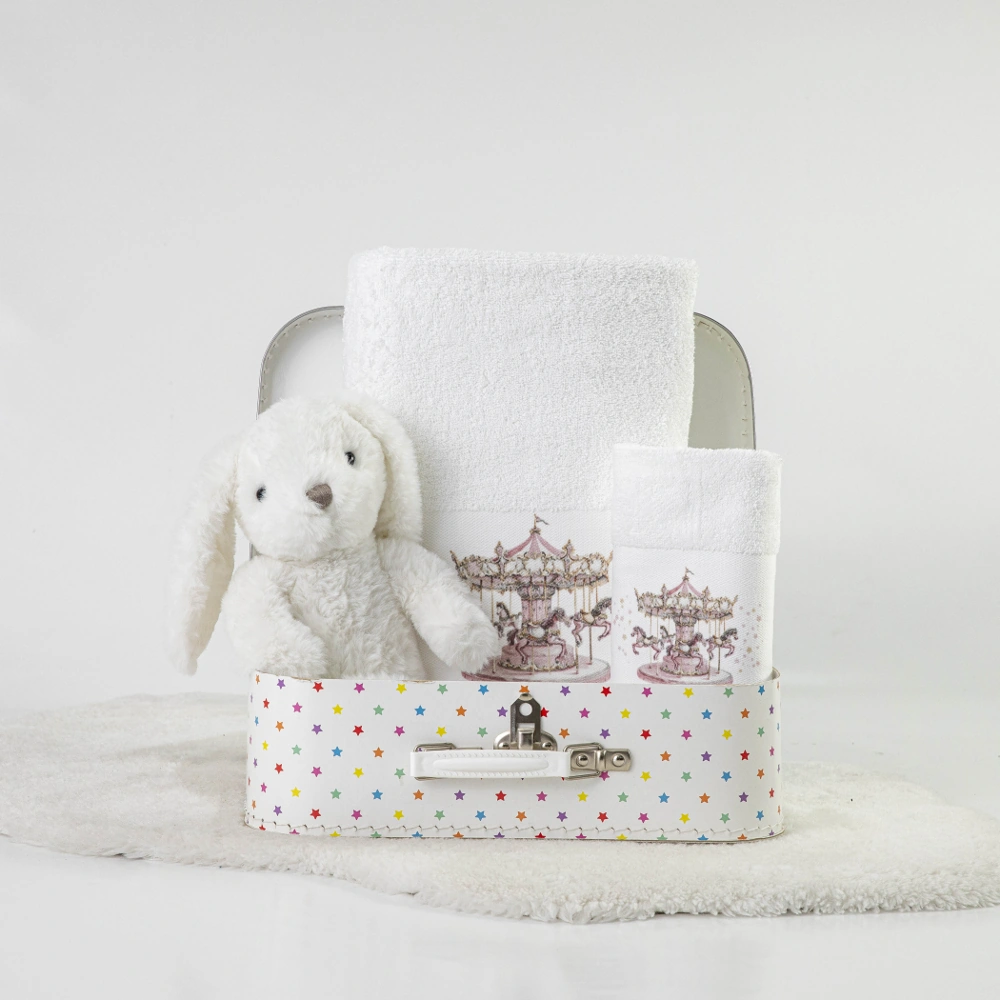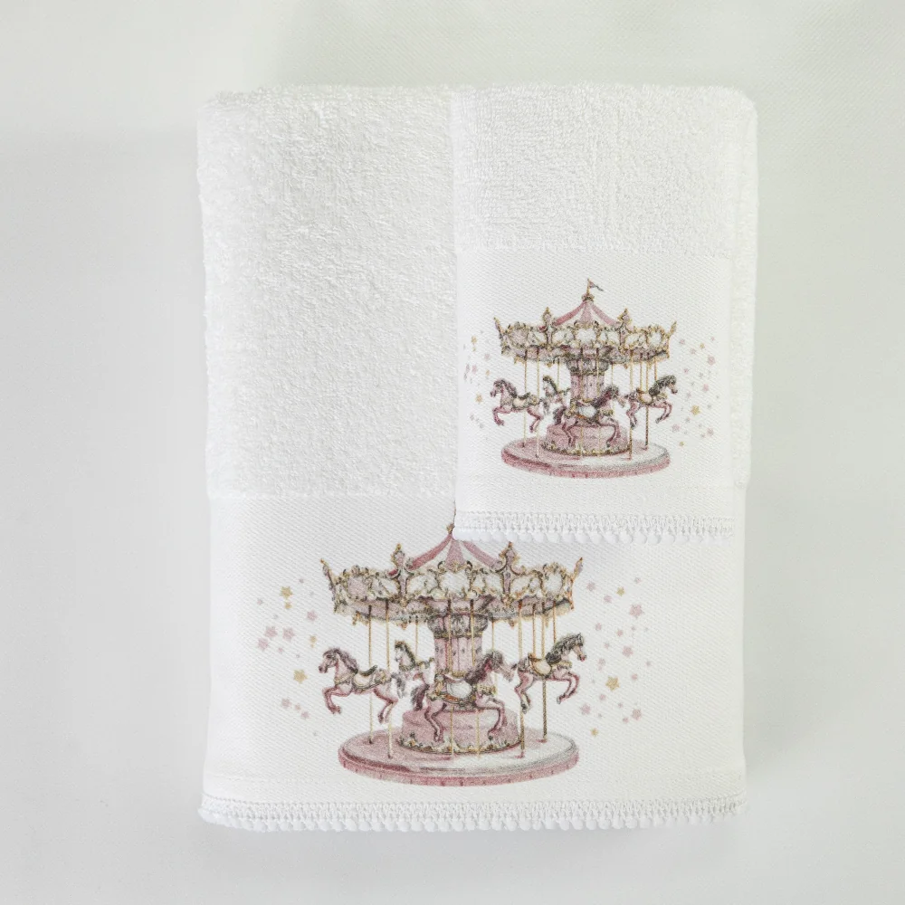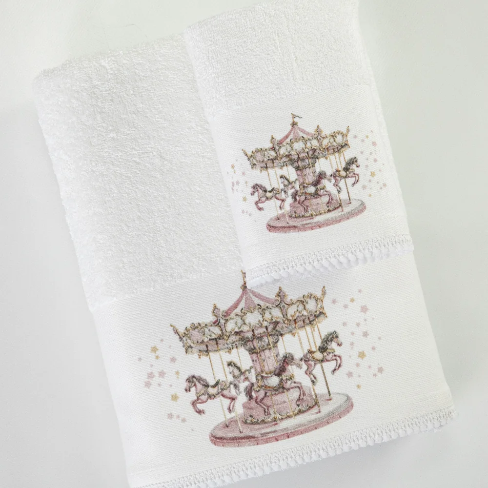 Σετ πετσέτες 2 τεμαχίων, μπάνιου και χειρός, από ύφασμα φροτέ πενιέ, 100% βαμβακερό, μονόχρωμο, λευκό, με ψηφιακή εκτύπωση σε χρώμα ροζ και δαντέλα, σχέδιο καρουζέλ.