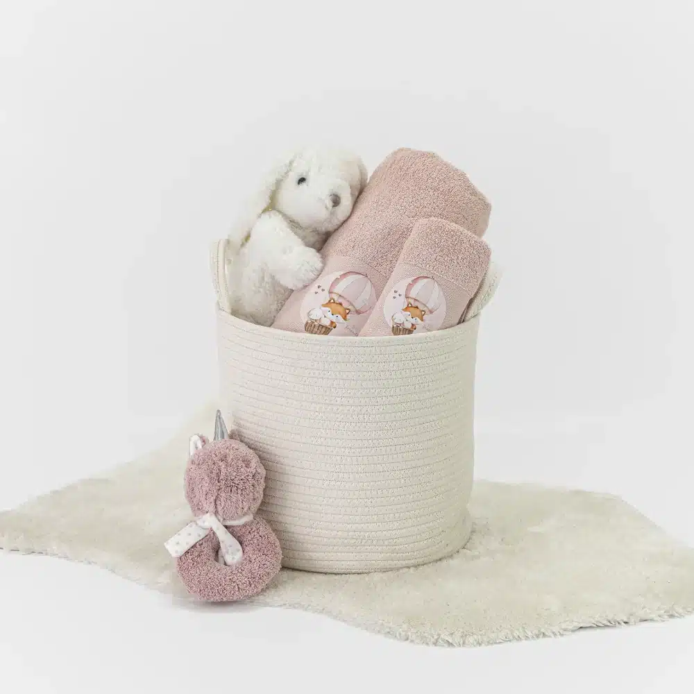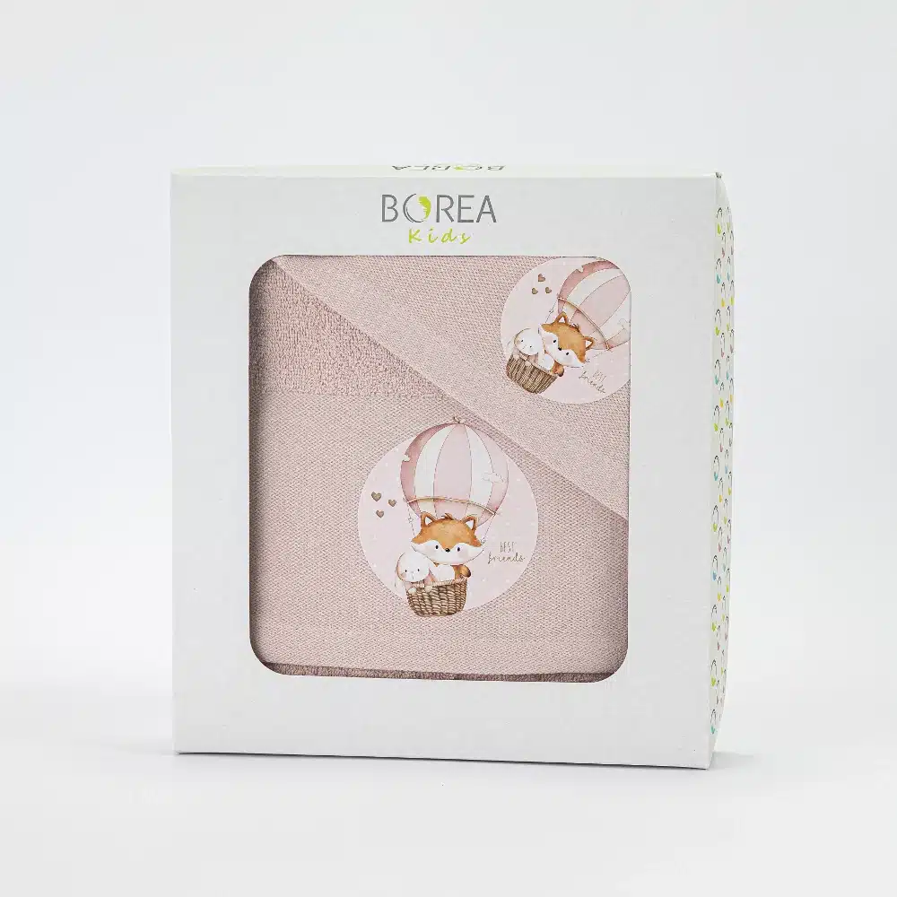 Σετ πετσέτες 2 τεμαχίων, μπάνιου και χειρός, από ύφασμα φροτέ πενιέ, 100% βαμβακερό, μονόχρωμο, πούδρα, με απλικέ, σχέδιο ζωάκια σε αερόστατο.