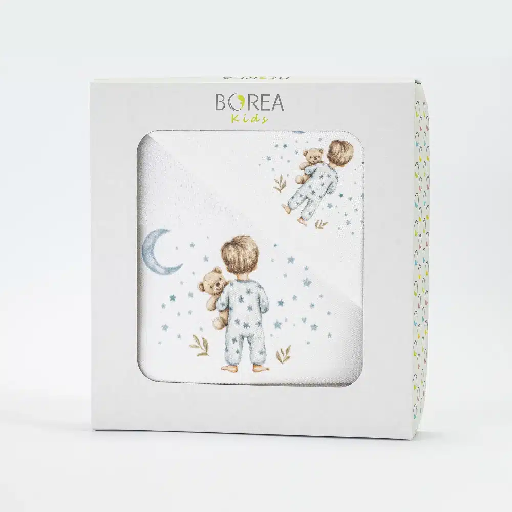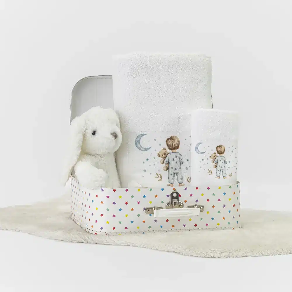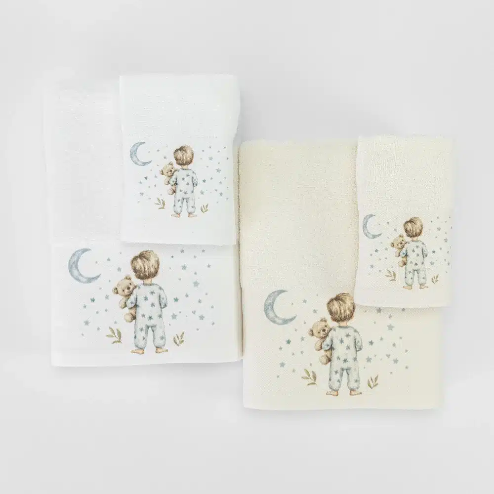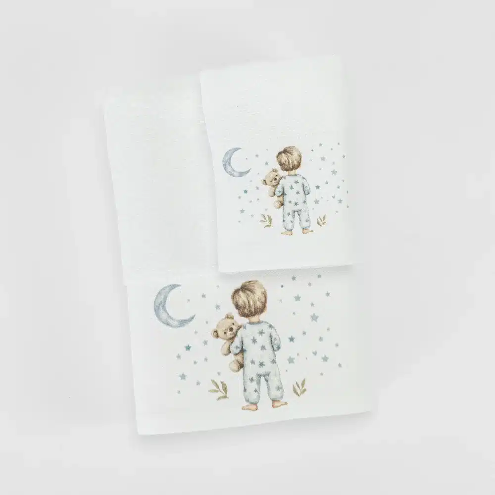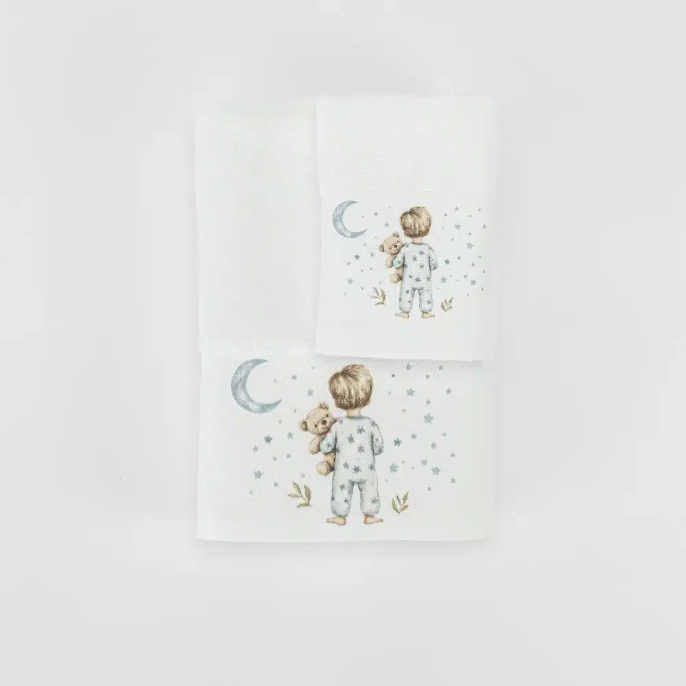 Σετ πετσέτες 2 τεμαχίων, μπάνιου και χειρός, από ύφασμα φροτέ πενιέ, 100% βαμβακερό, μονόχρωμο, με ψηφιακή εκτύπωση, σχέδιο με παιδάκια με βρεφικές πιτζάμες. Διατίθεται σε 2 χρώματα.