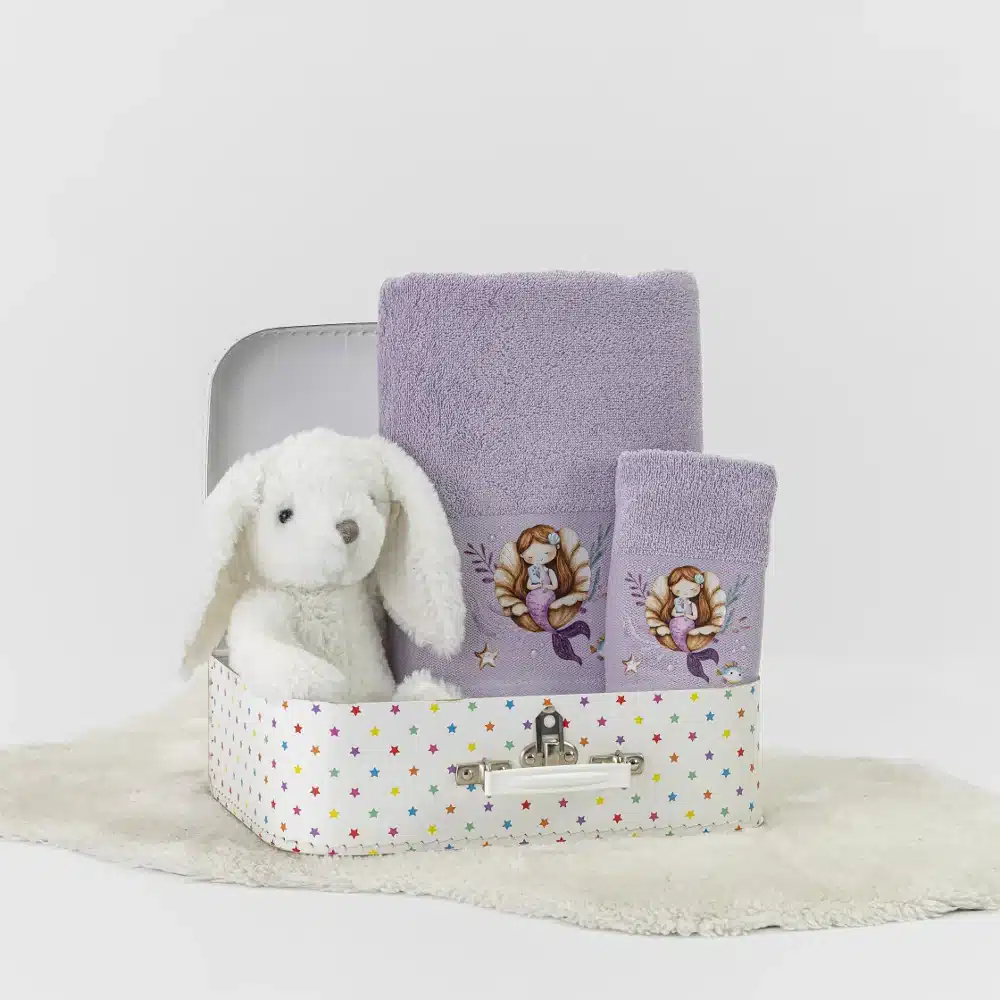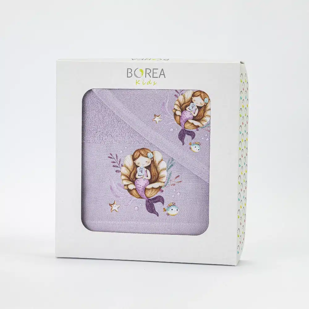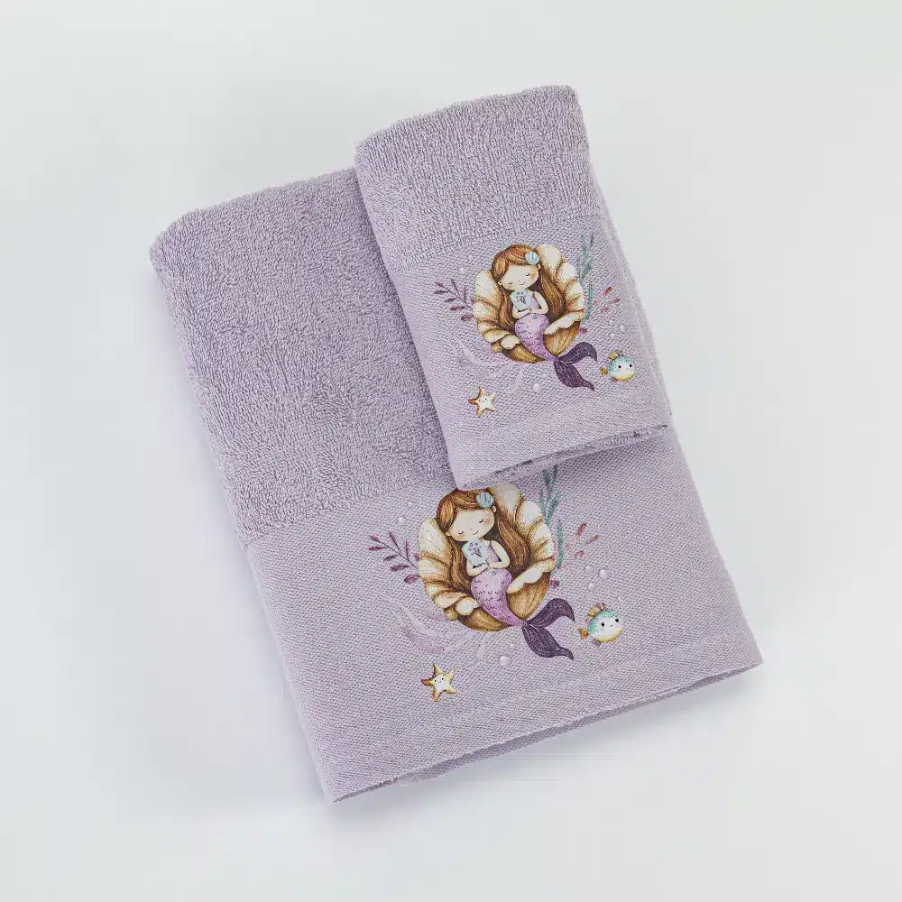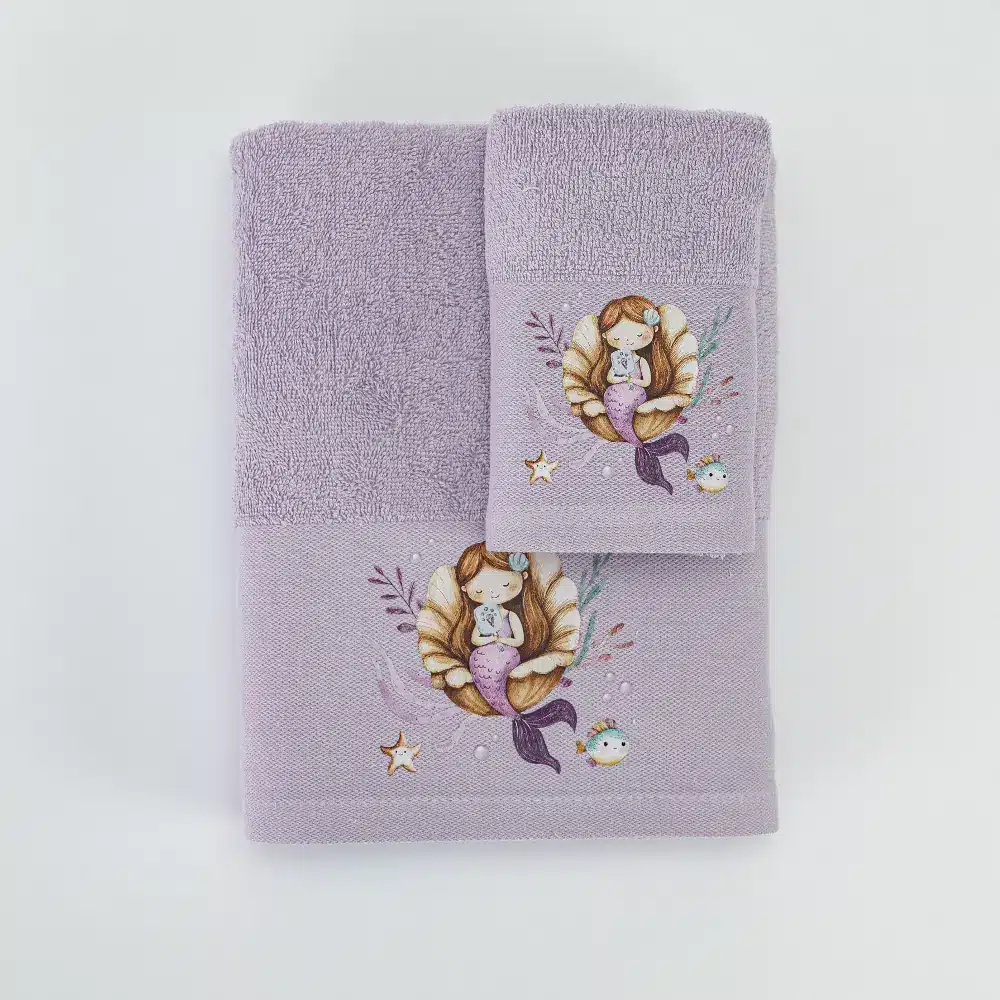 Σετ πετσέτες 2 τεμαχίων, μπάνιου και χειρός, από ύφασμα φροτέ πενιέ, 100% βαμβακερό, μονόχρωμο, λιλά, με απλικέ, σχέδιο γοργόνα.