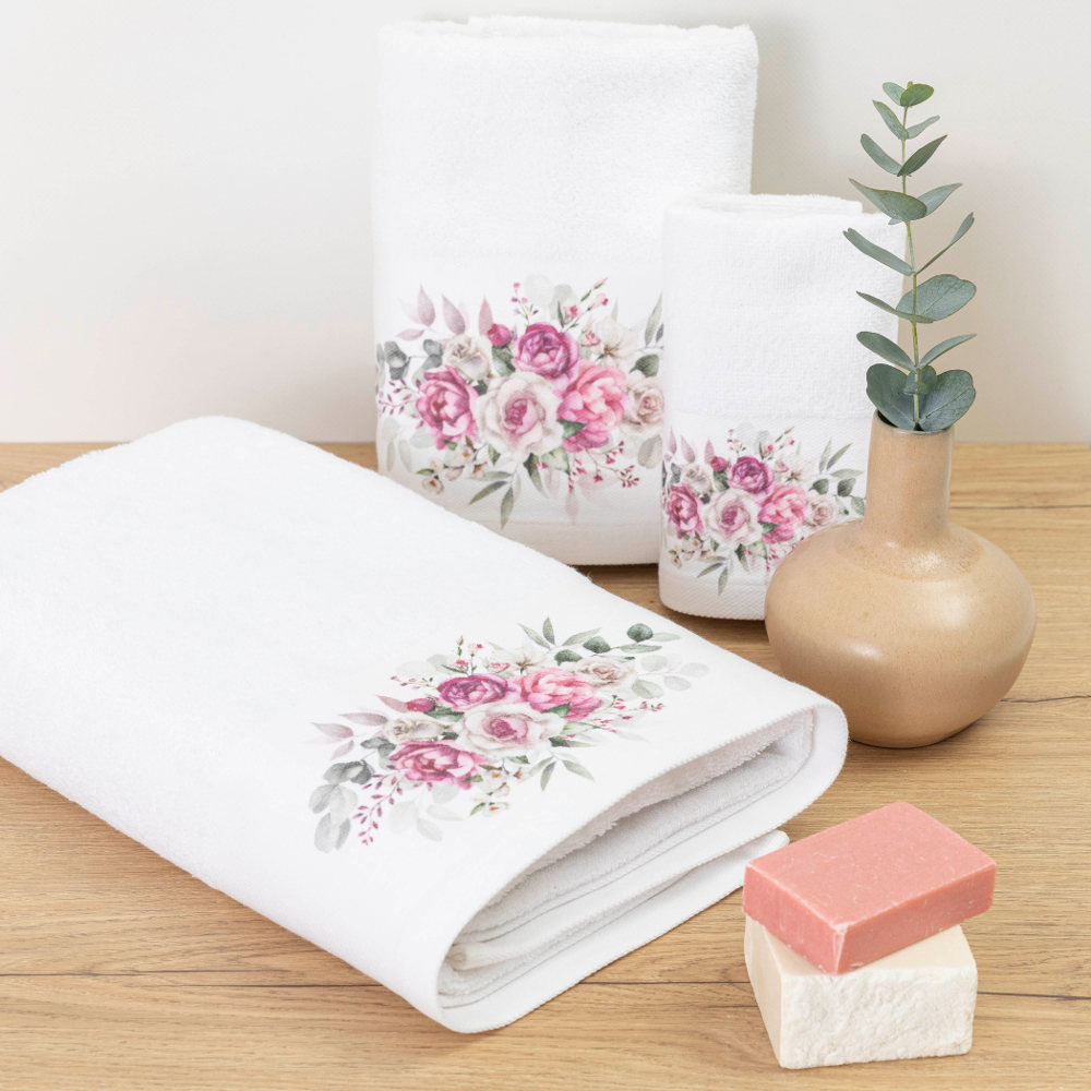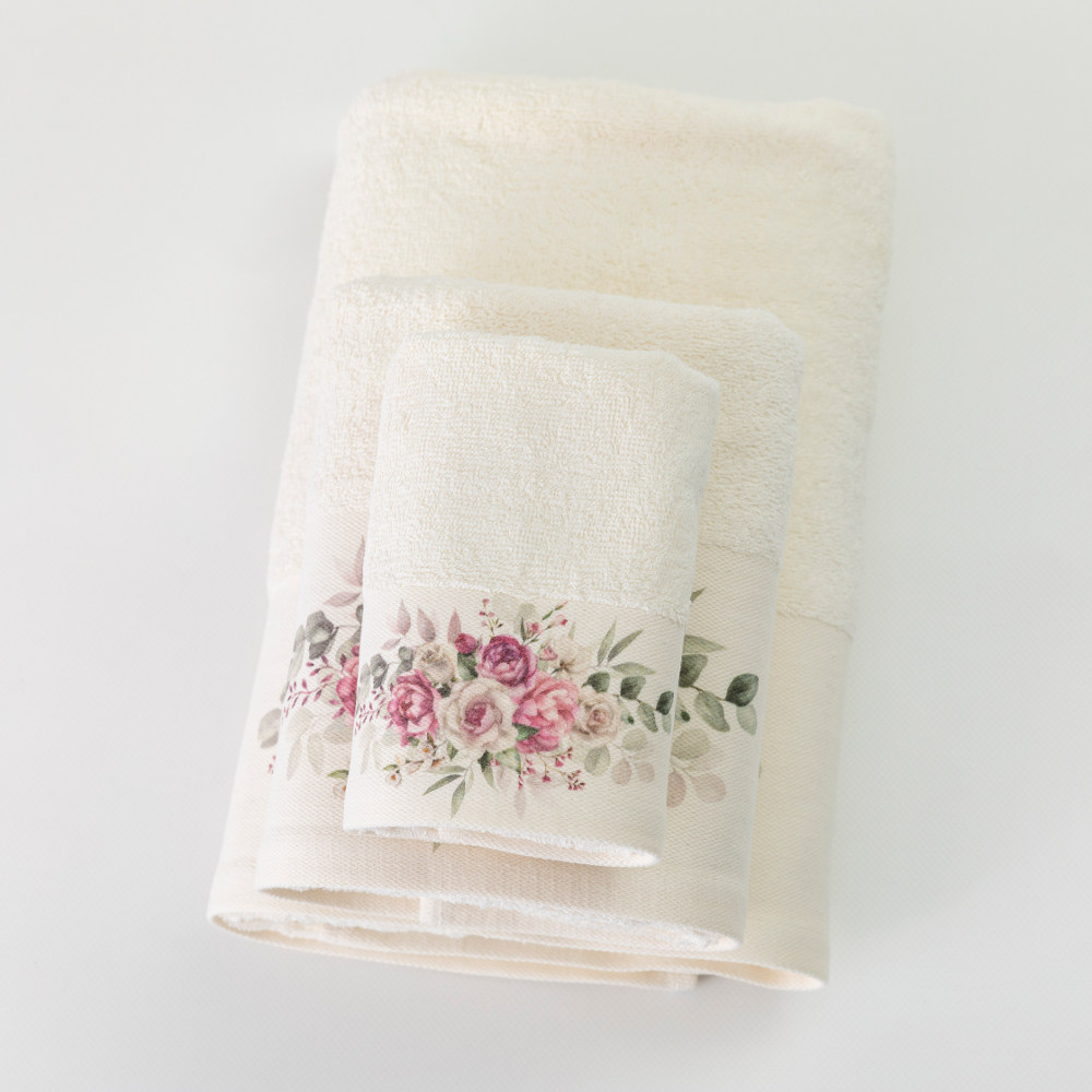 Σετ πετσέτες 3 τεμαχίων, μπάνιου, προσώπου και χειρός, από ύφασμα φροτέ, πενιέ, 100% βαμβακερό, με ψηφιακή εκτύπωση.Διατίθεται σε 2 χρώματα.