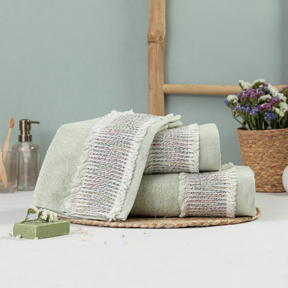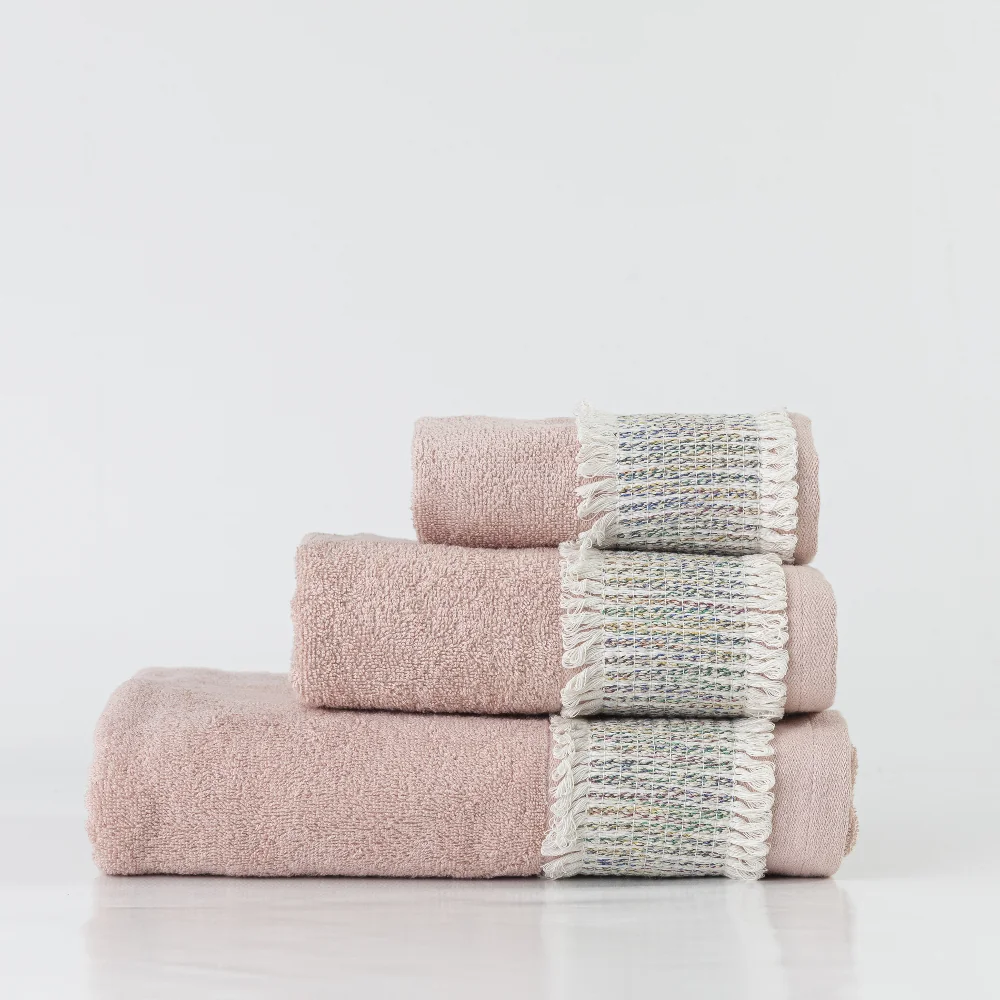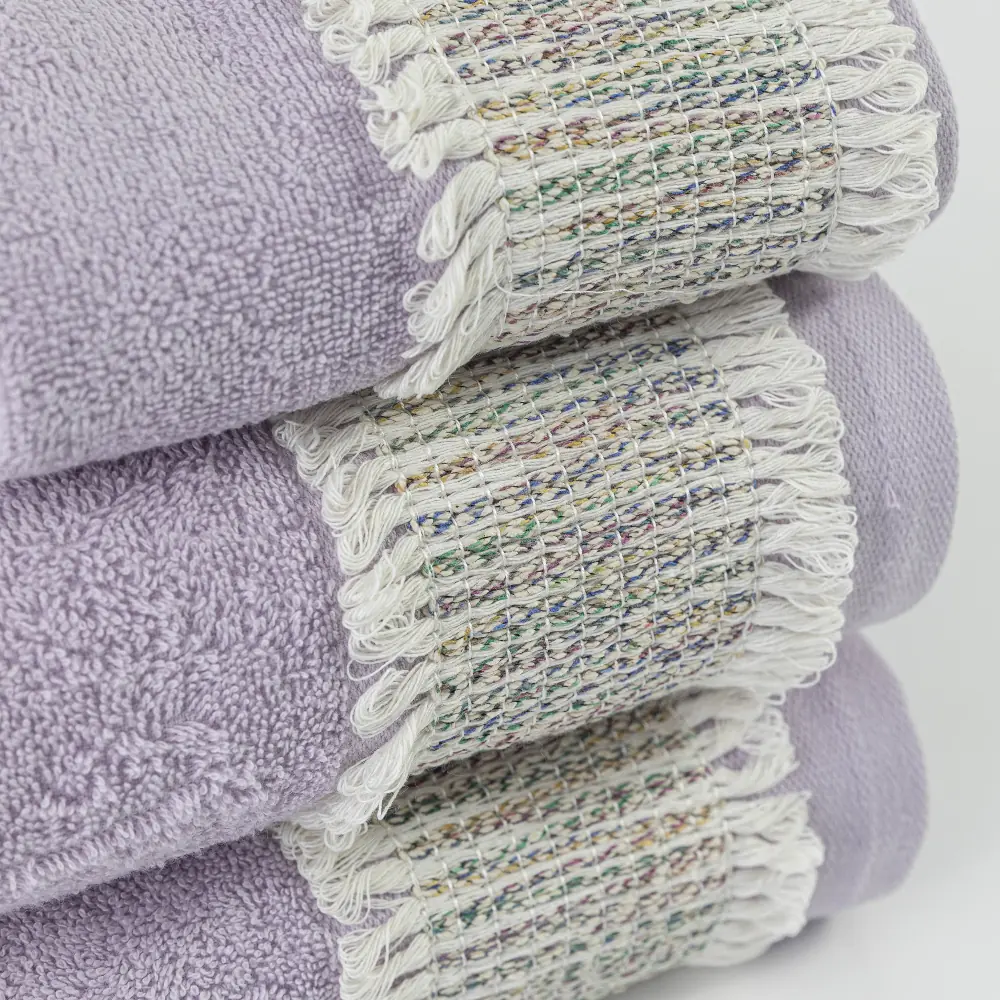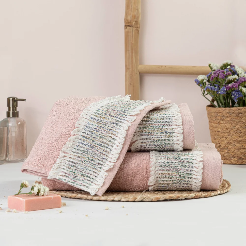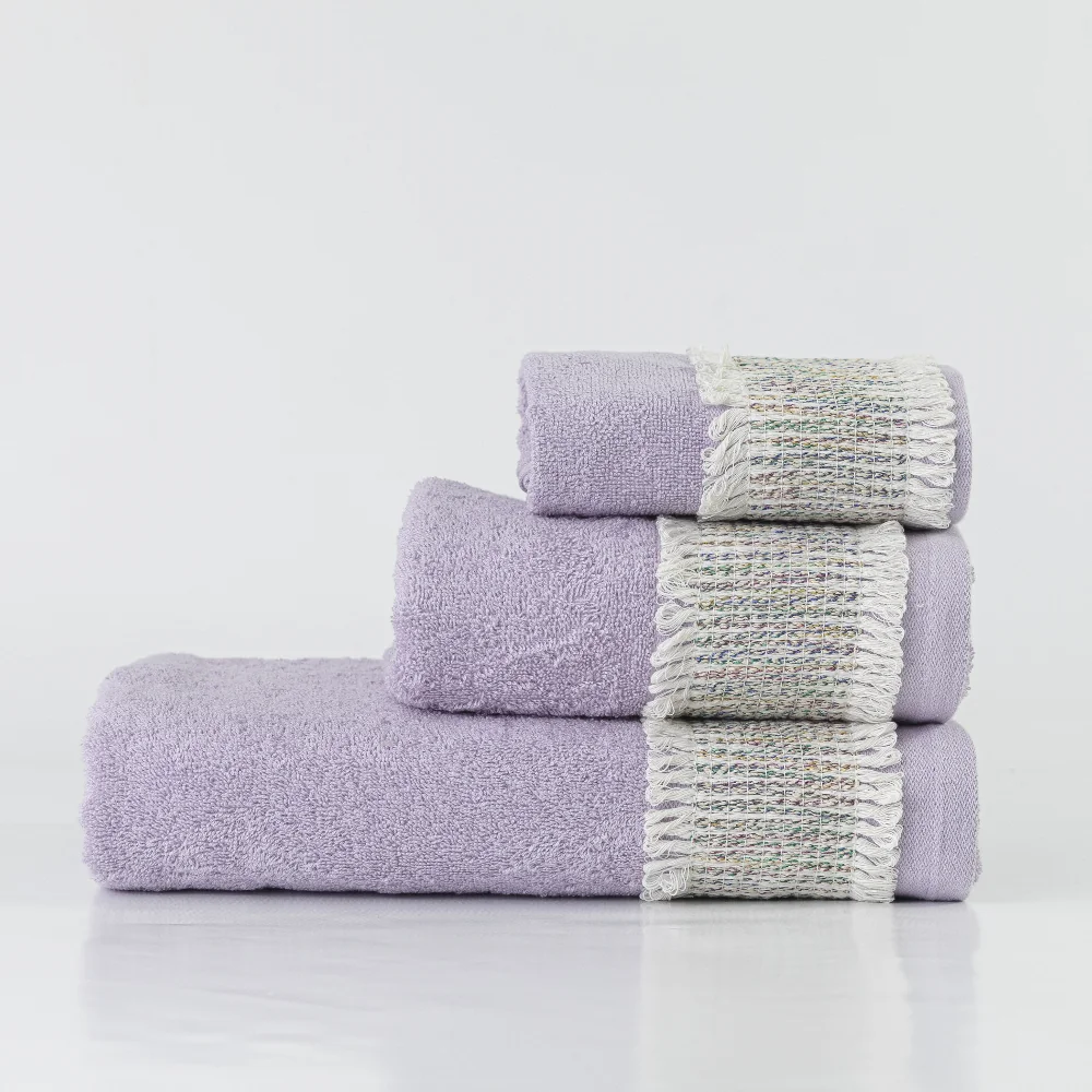 Σετ πετσέτες 3 τεμαχίων, μπάνιου, προσώπου και χειρός, από ύφασμα φροτέ, πενιέ, 100% βαμβακερό, με διακοσμητική πλεχτή δαντέλα. Διατίθεται σε 4 χρώματα.