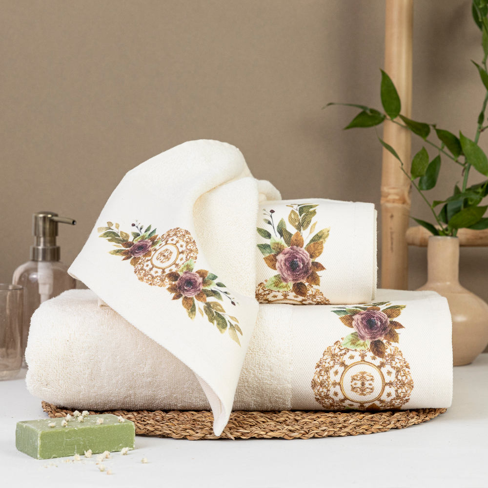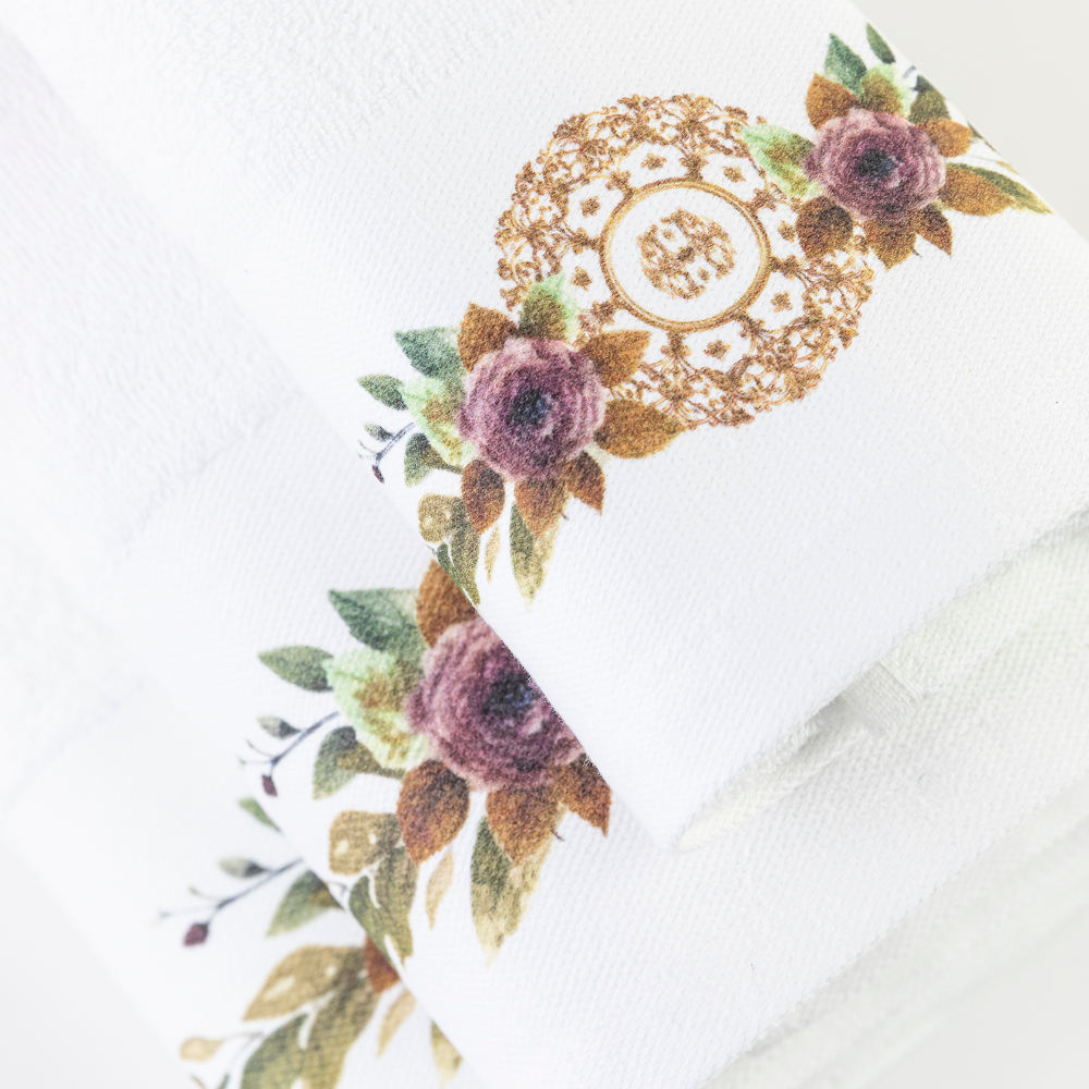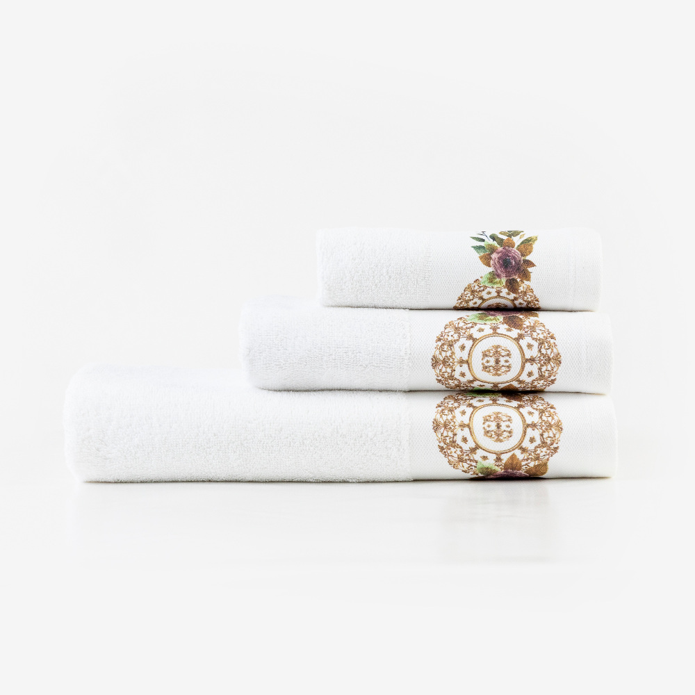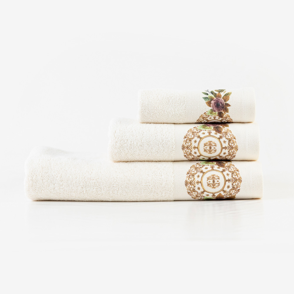 Σετ πετσέτες 3 τεμαχίων, μπάνιου, προσώπου και χειρός, από ύφασμα φροτέ, πενιέ, 100% βαμβακερό, με ψηφιακή εκτύπωση.Διατίθεται σε 2 χρώματα.