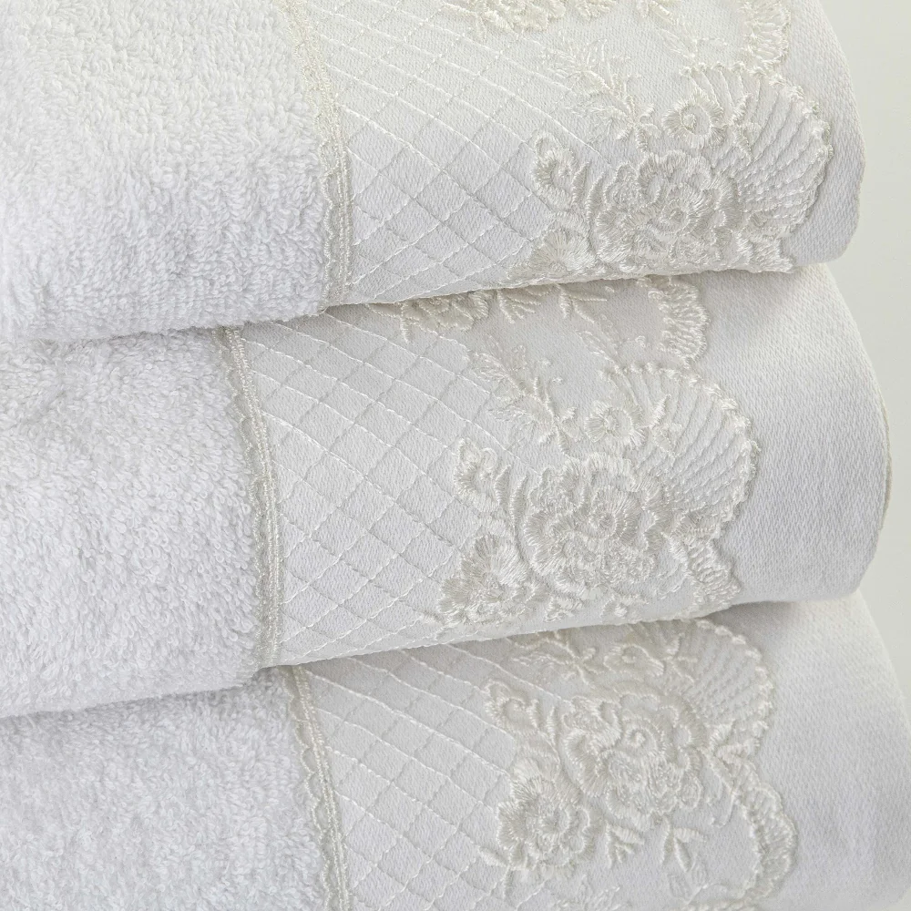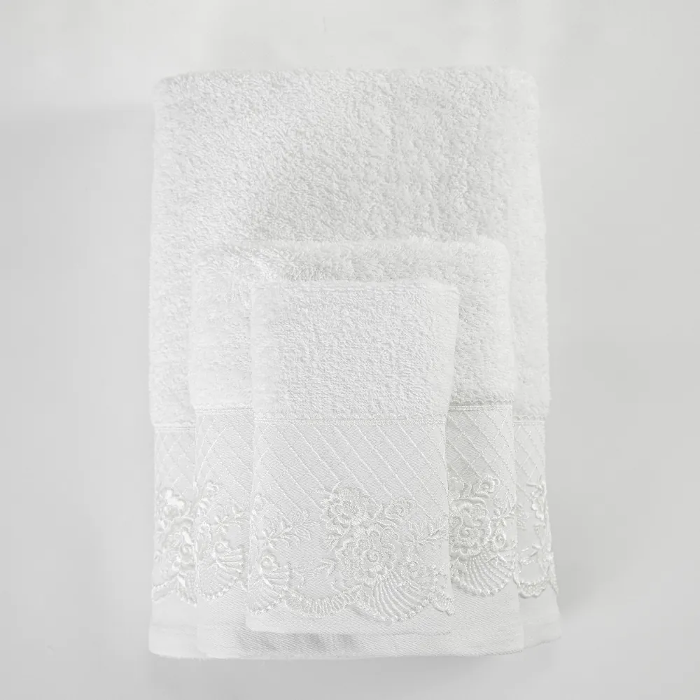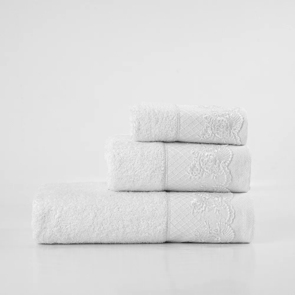 Σετ πετσέτες 3 τεμαχίων, μπάνιου, προσώπου και χειρός, από ύφασμα φροτέ, πενιέ, 100% βαμβακερό, με διακοσμητική δαντέλα. Διατίθεται σε 2 χρώματα.