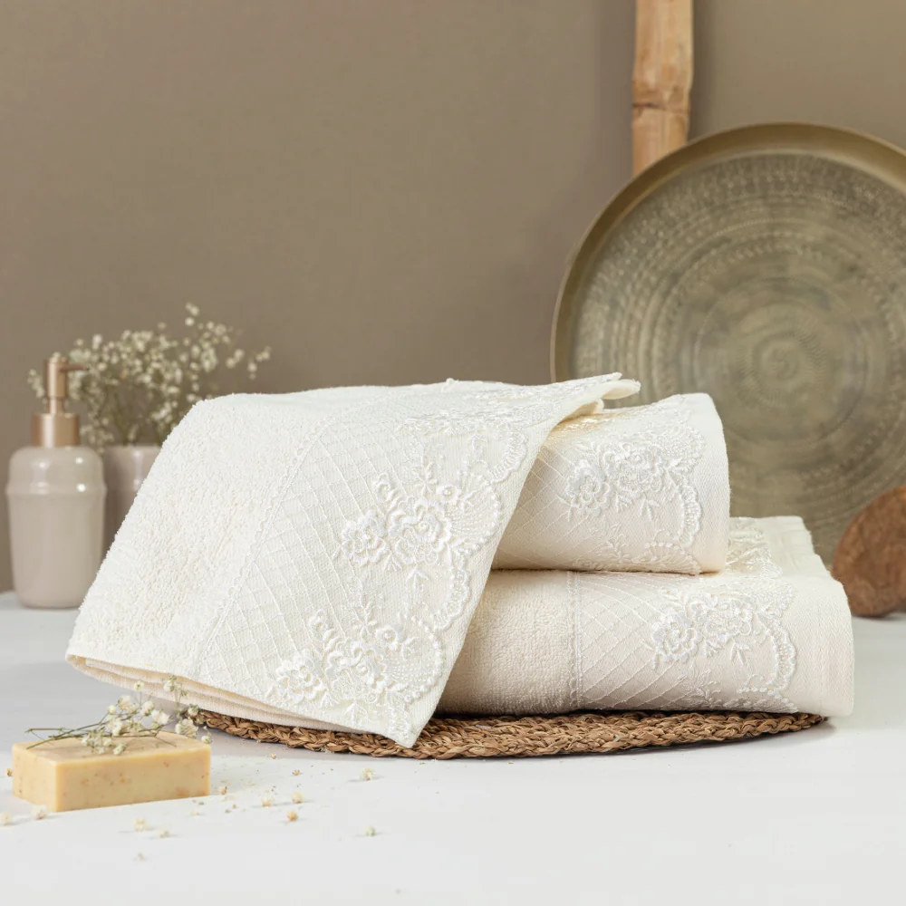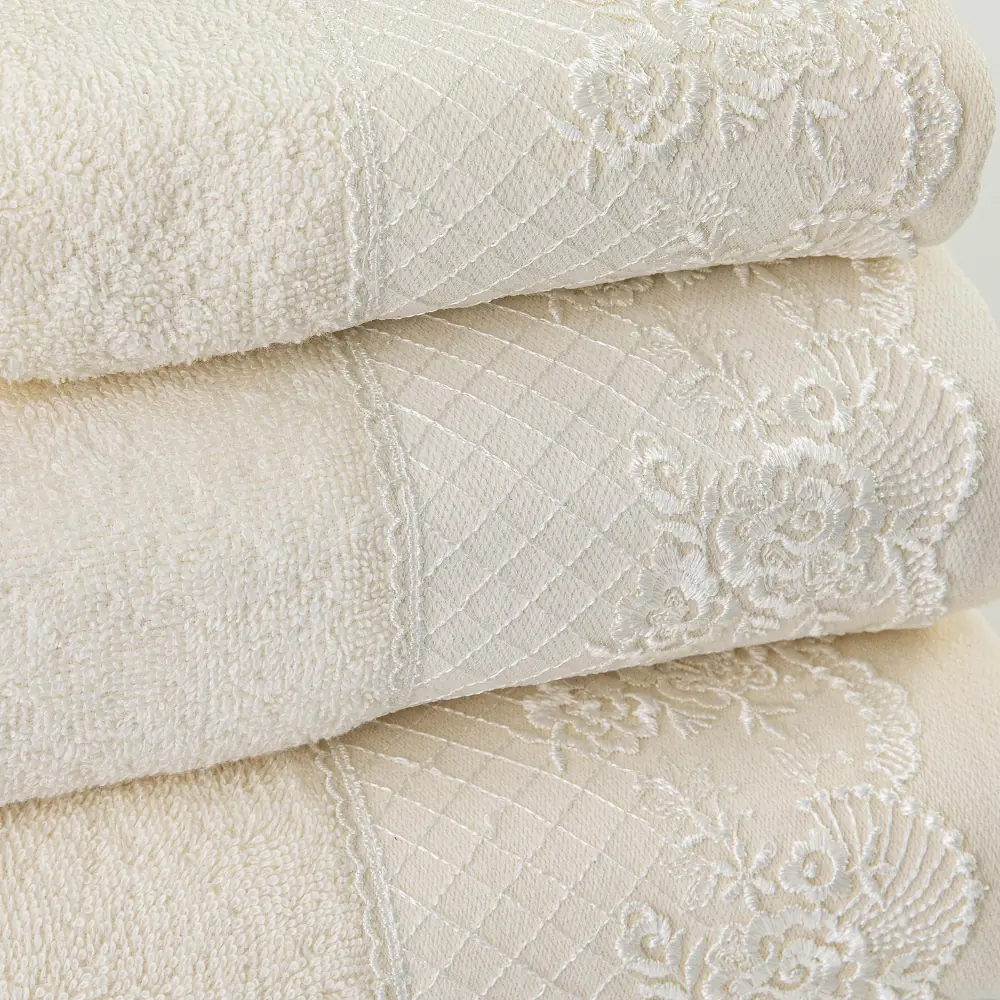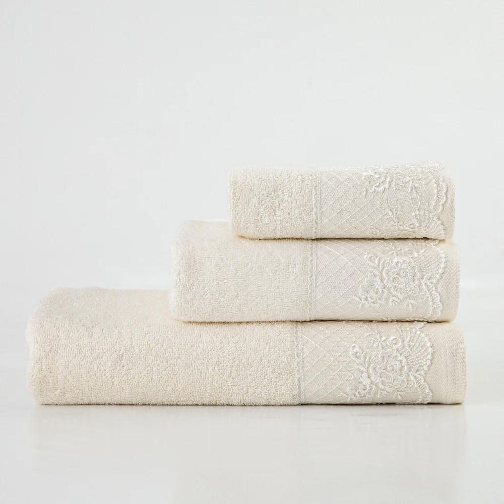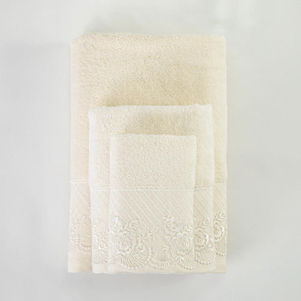 Σετ πετσέτες 3 τεμαχίων, μπάνιου, προσώπου και χειρός, από ύφασμα φροτέ, πενιέ, 100% βαμβακερό, με διακοσμητική δαντέλα. Διατίθεται σε 2 χρώματα.