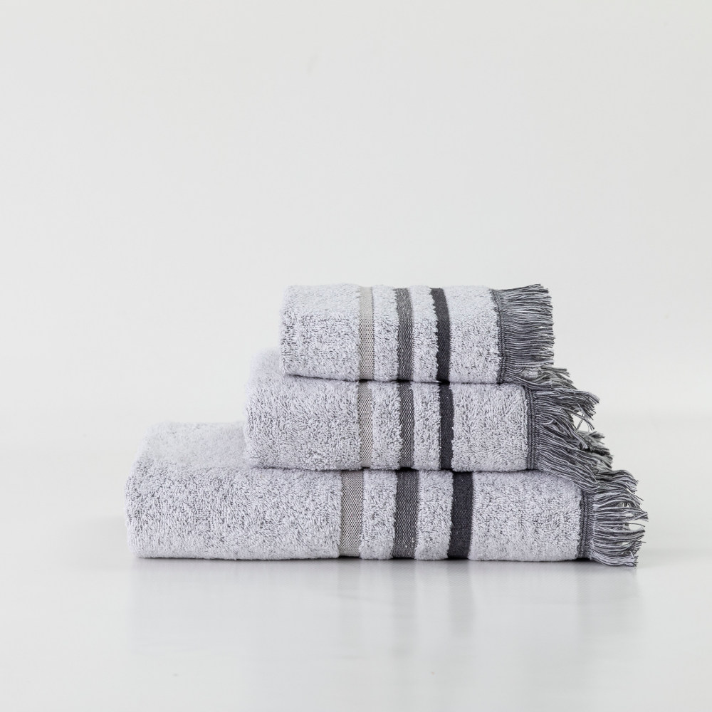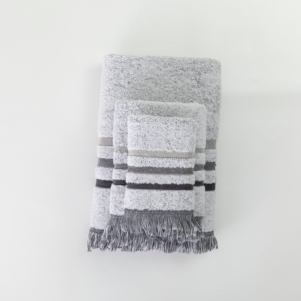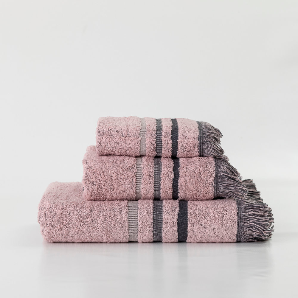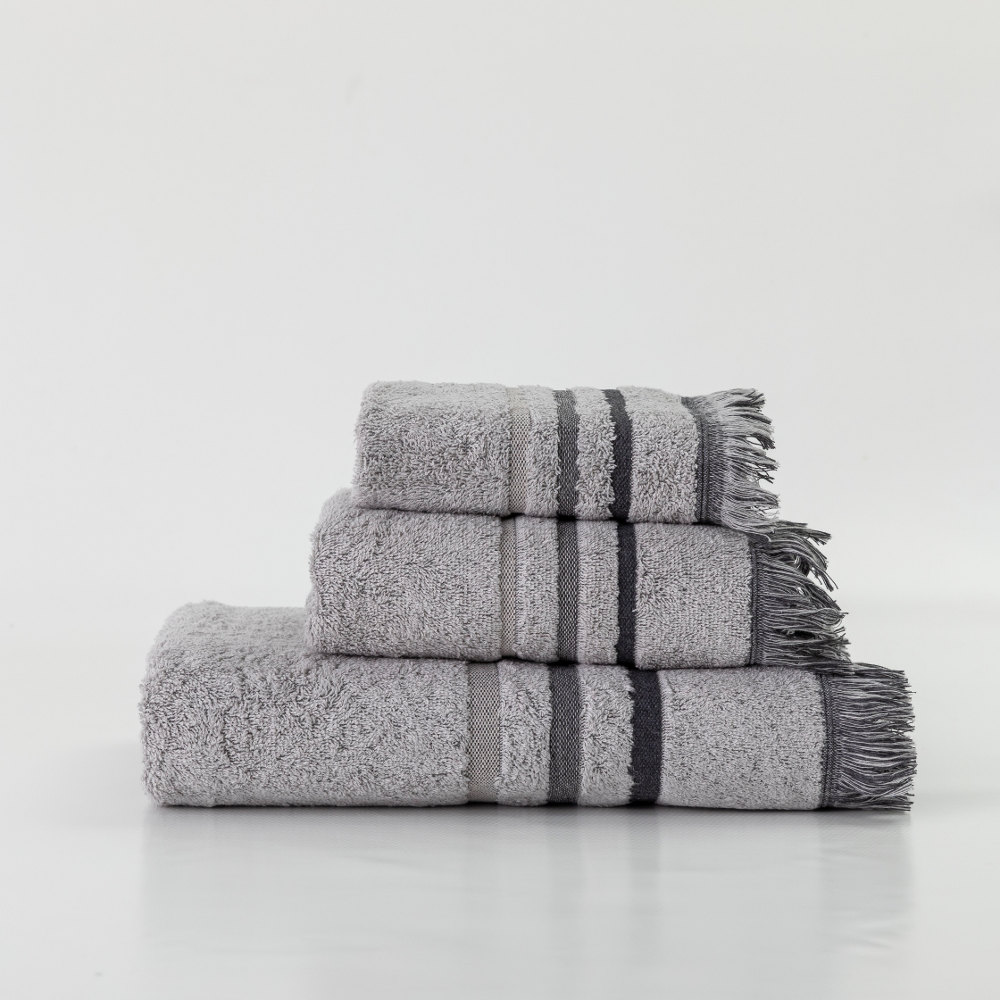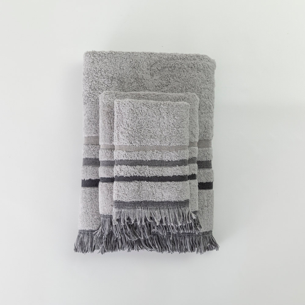 Σετ πετσέτες 3 τεμαχίων, μπάνιου, προσώπου και χειρός, από ύφασμα φροτέ, πενιέ, 100% βαμβακερό με μπορντούρα και κρόσσι. Διατίθεται σε 4 χρώματα.