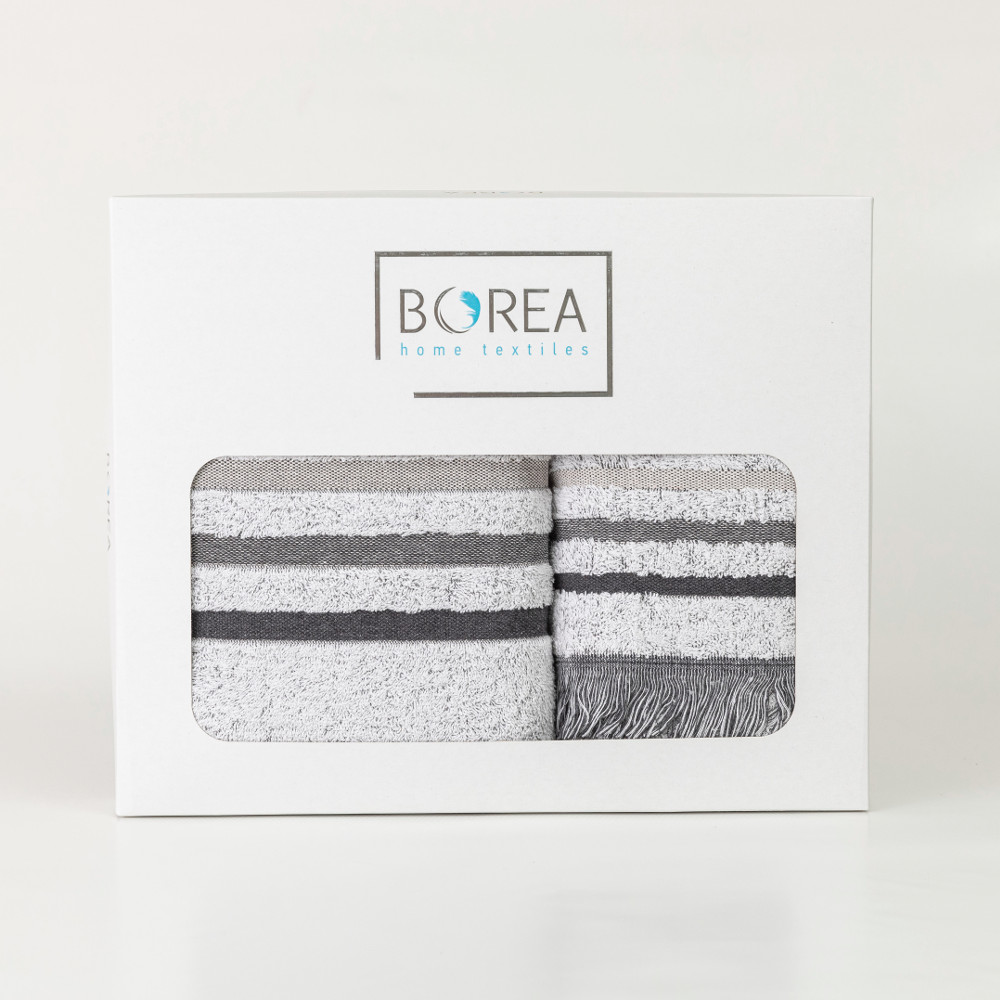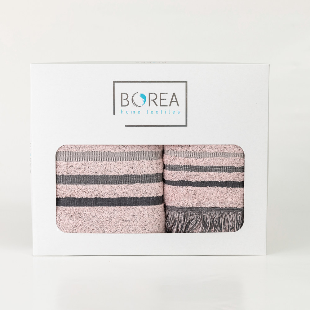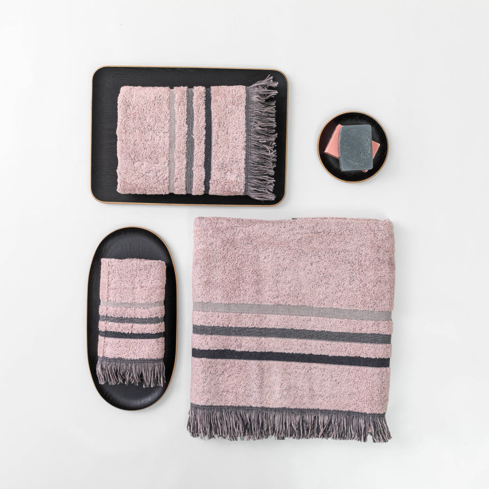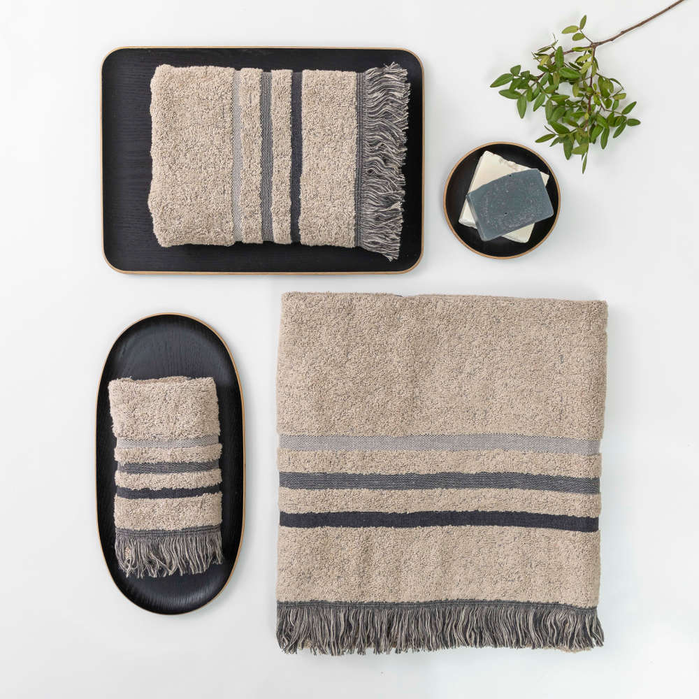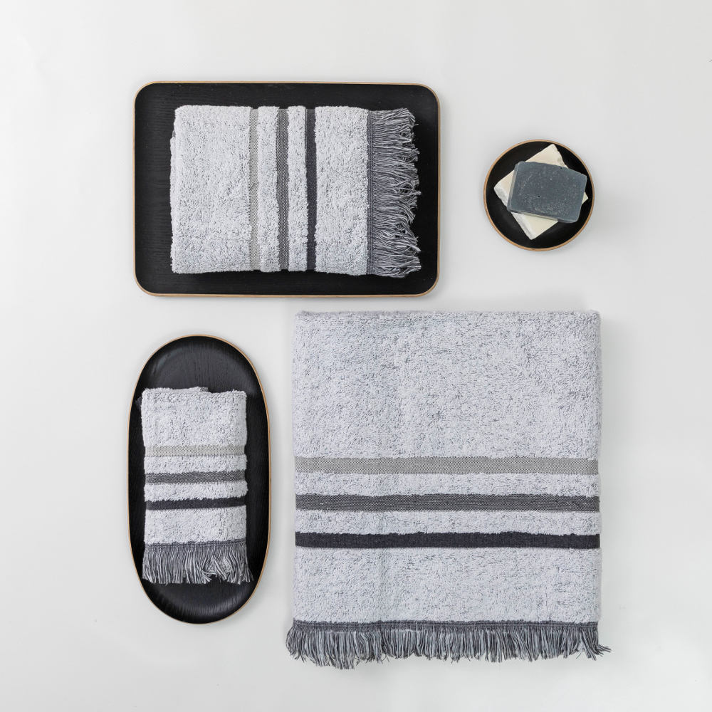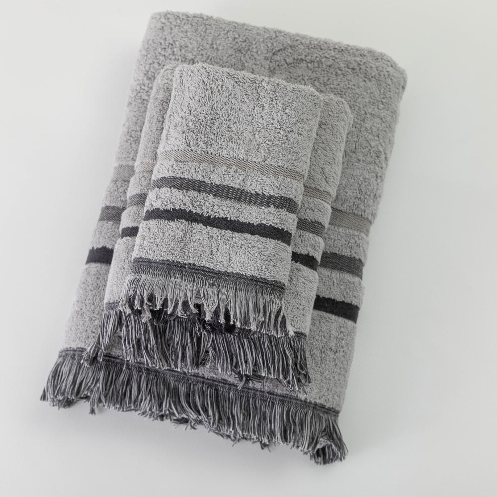 Σετ πετσέτες 3 τεμαχίων, μπάνιου, προσώπου και χειρός, από ύφασμα φροτέ, πενιέ, 100% βαμβακερό με μπορντούρα και κρόσσι. Διατίθεται σε 4 χρώματα.