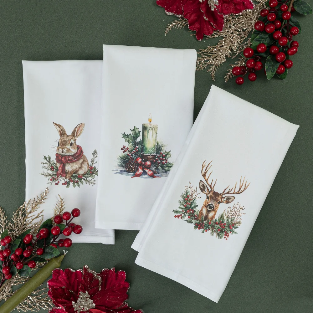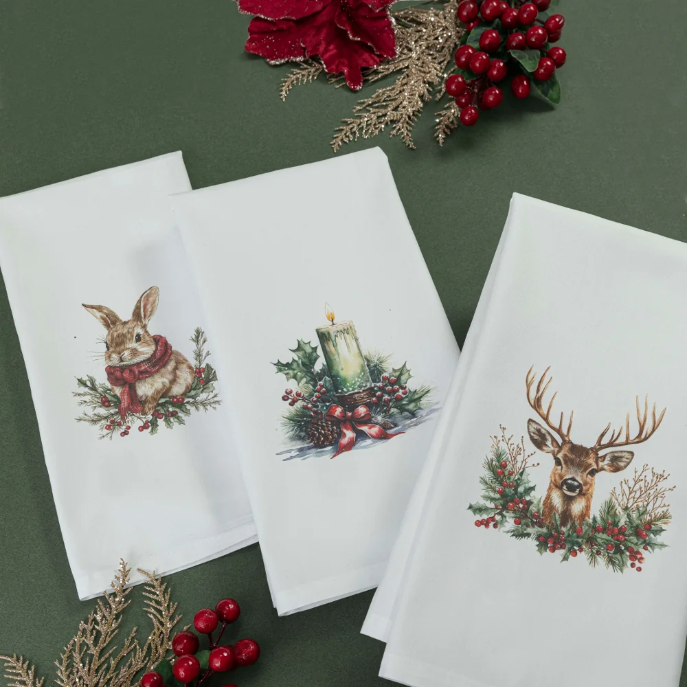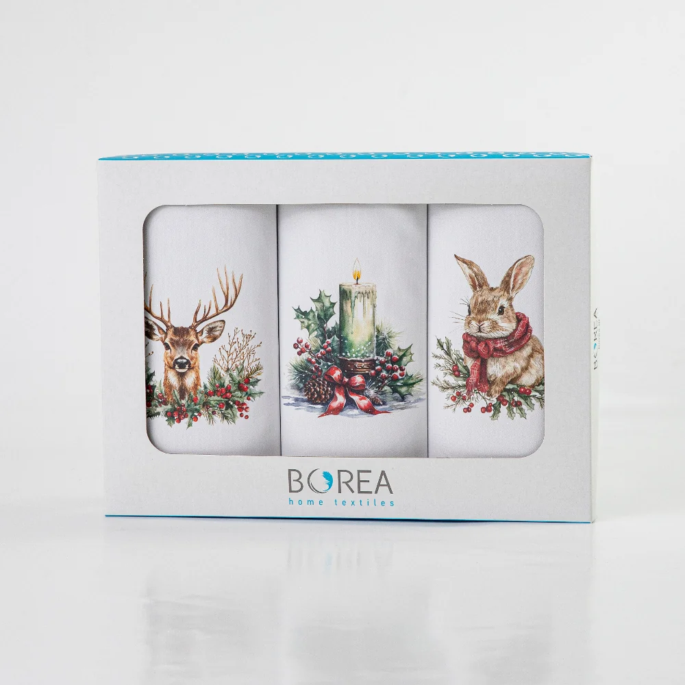 Σετ από 3 ποτηρόπανα κουζίνας polycotton, 50% βαμβακερό-50% πολυέστερ, λευκό με χριστουγεννιάτικη ψηφιακή εκτύπωση σε κουτί συσκευασίας δώρου. Για σκούπισμα των πιάτων χωρίς χνούδι.
