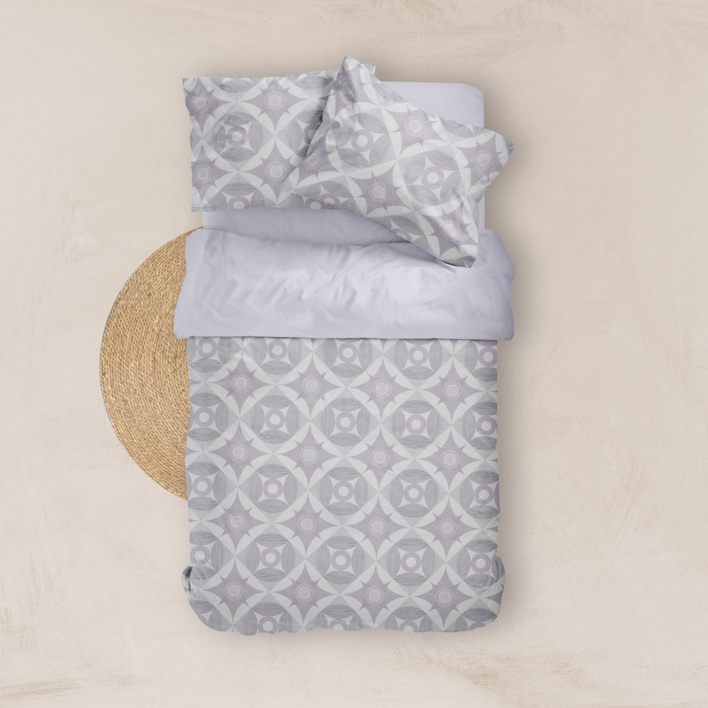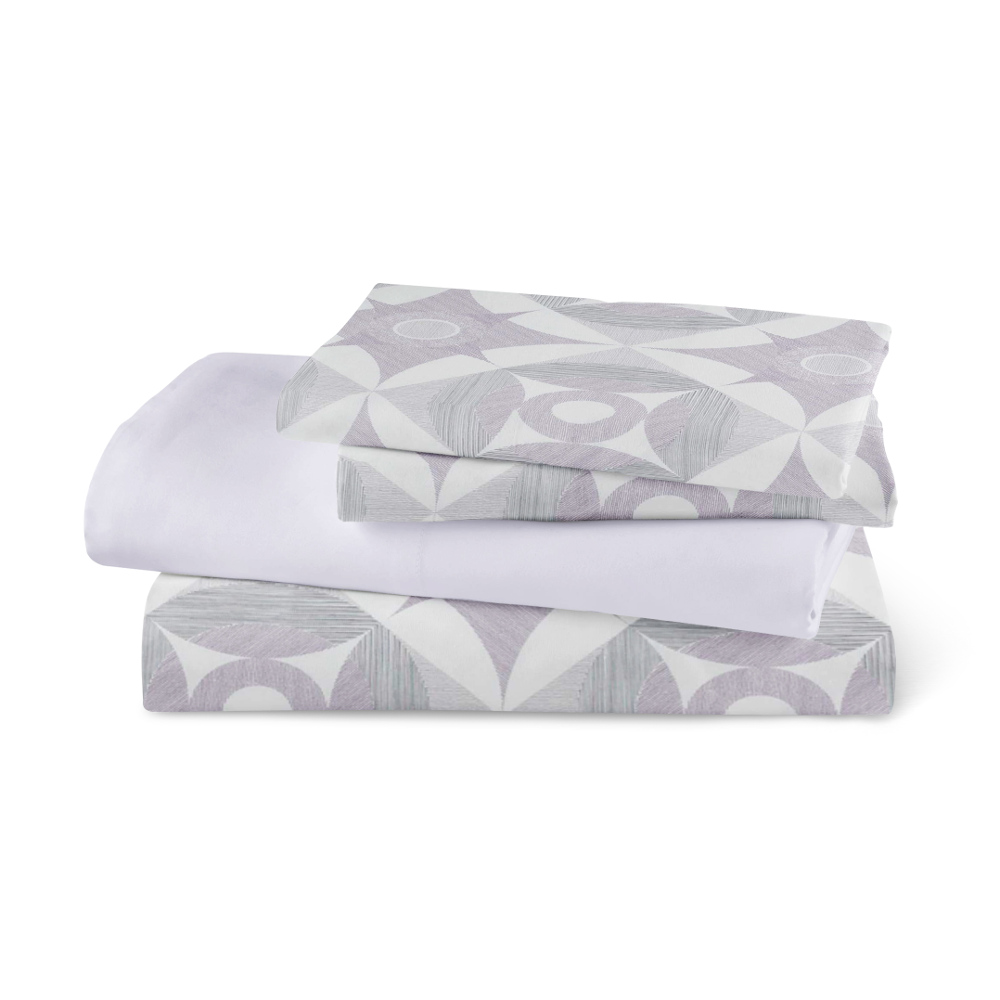 Σετ σεντόνια υπέρδιπλα με μαξιλαροθήκες από ύφασμα μερσεριζέ, 160 κλωστών, 100% βαμβακερό, συνδυασμός εμπριμέ γεωμετρικού μοτίβου και μονοχρωμίας, σε χρώμα λιλά.