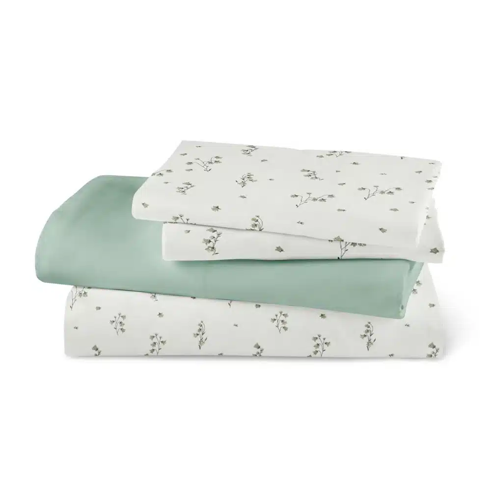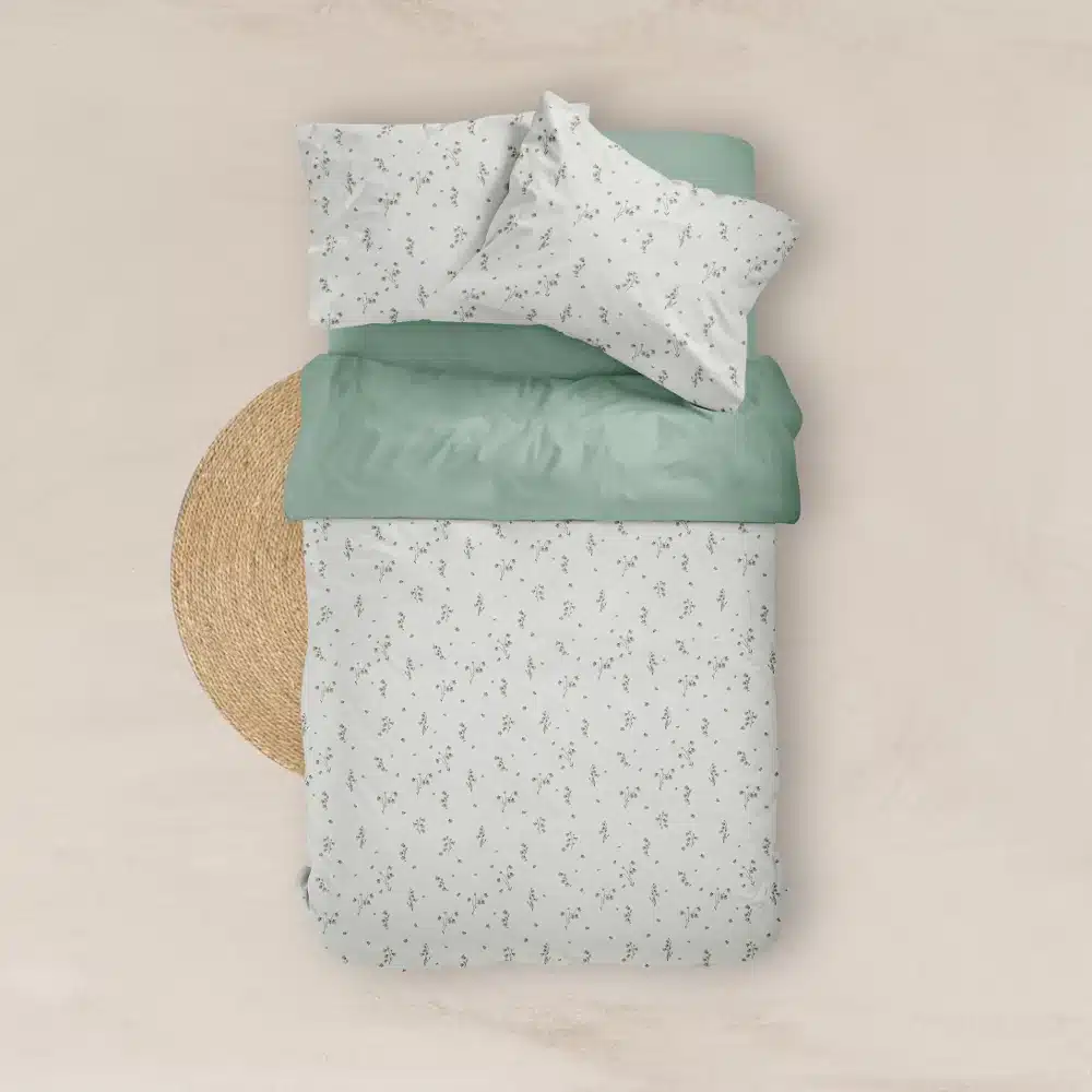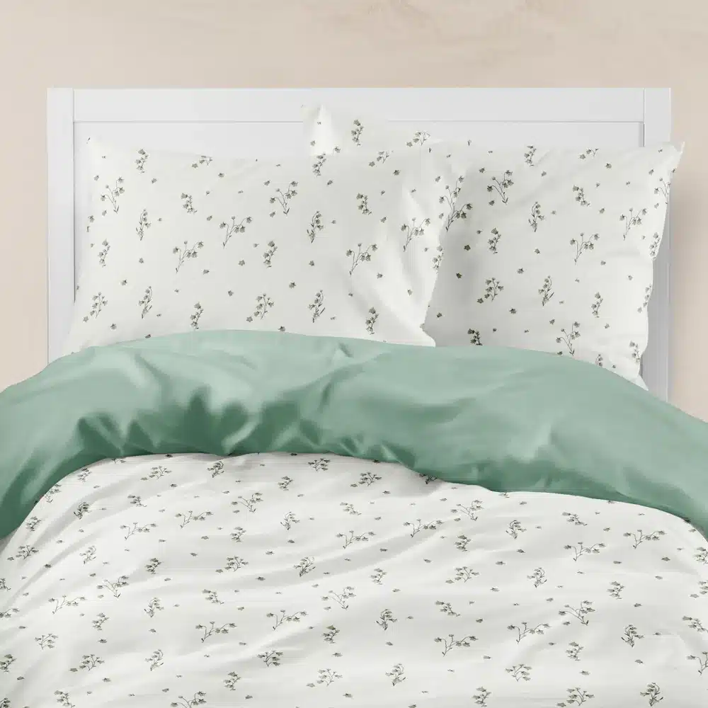 Σετ σεντόνια μονά με μαξιλαροθήκη από ύφασμα μερσεριζέ, 160 κλωστών, 100% βαμβακερό, συνδυασμός εμπριμέ φλοράλ μοτίβου και μονοχρωμίας, σε χρώμα λευκό με λαδί λεπτομέρειες.