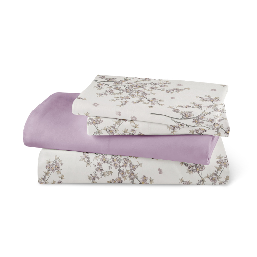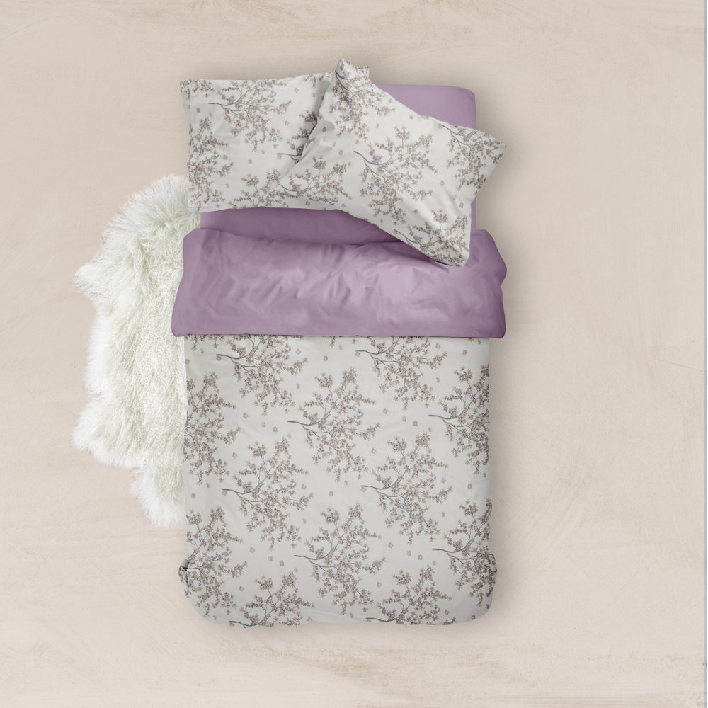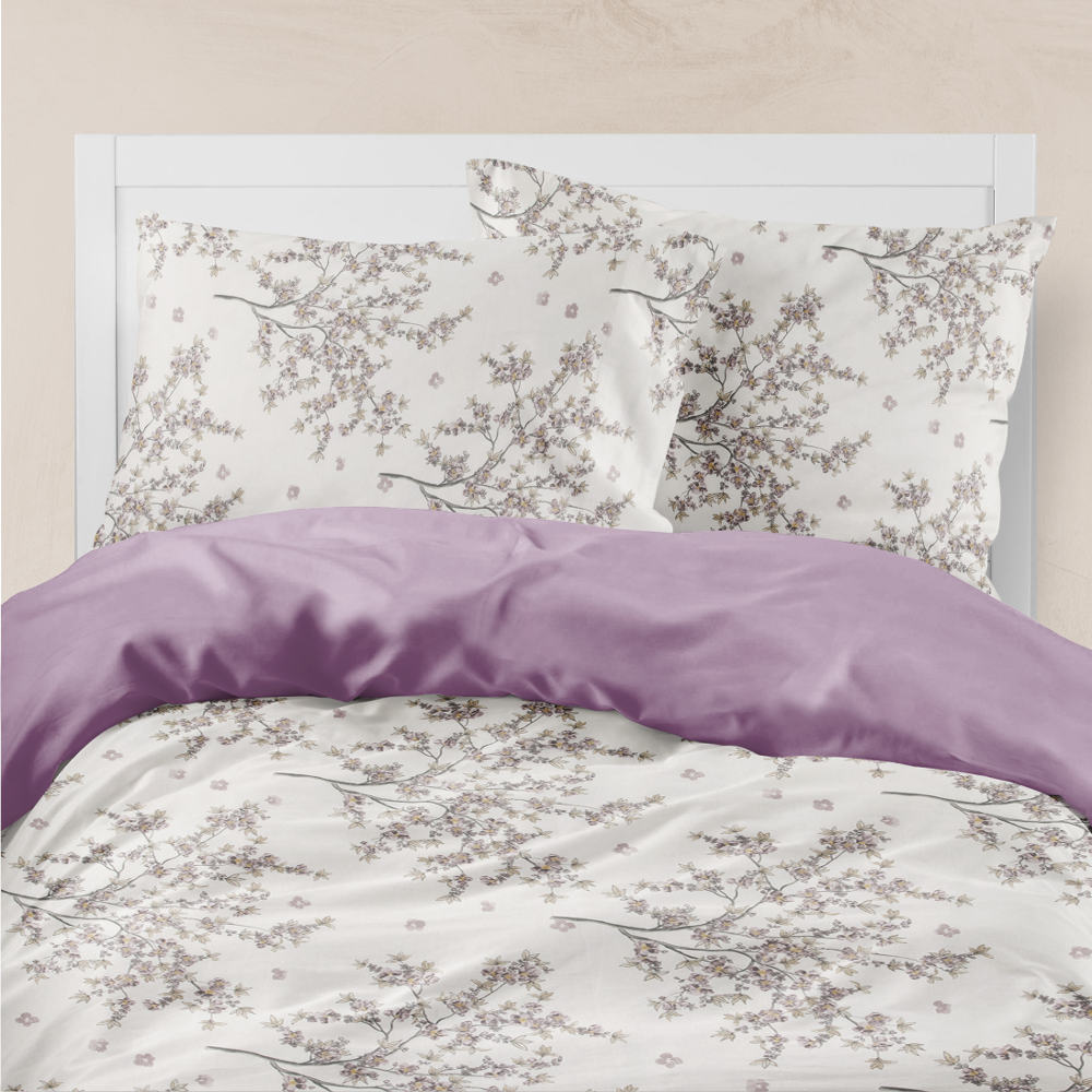Σετ σεντόνια υπέρδιπλα με μαξιλαροθήκες από ύφασμα μερσεριζέ, 160 κλωστών, 100% βαμβακερό, συνδυασμός φλοράλ μοτίβου και μονοχρωμίας, σε χρώμα σκούρο μωβ.