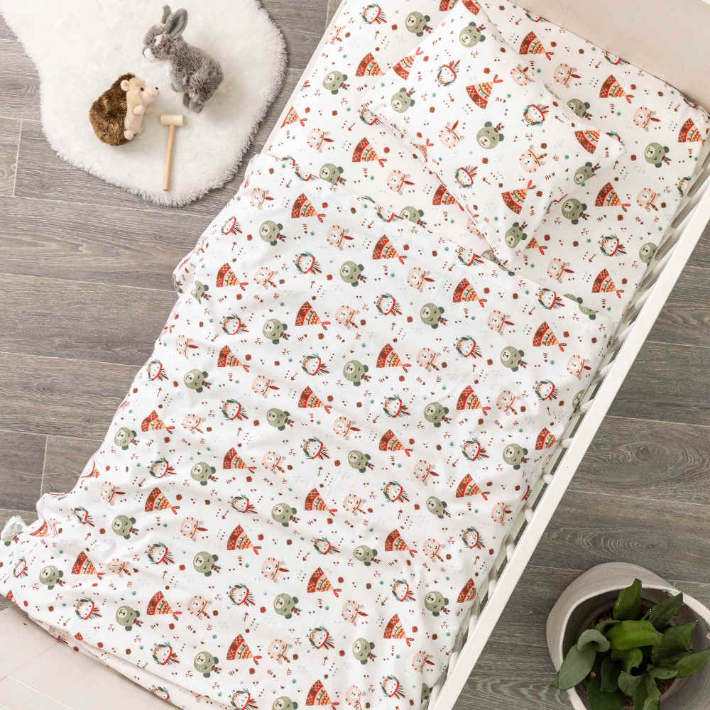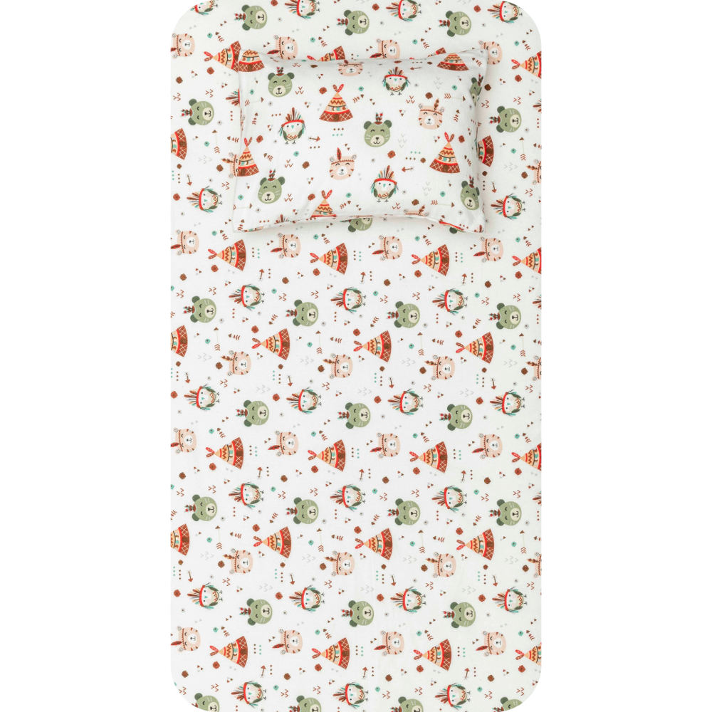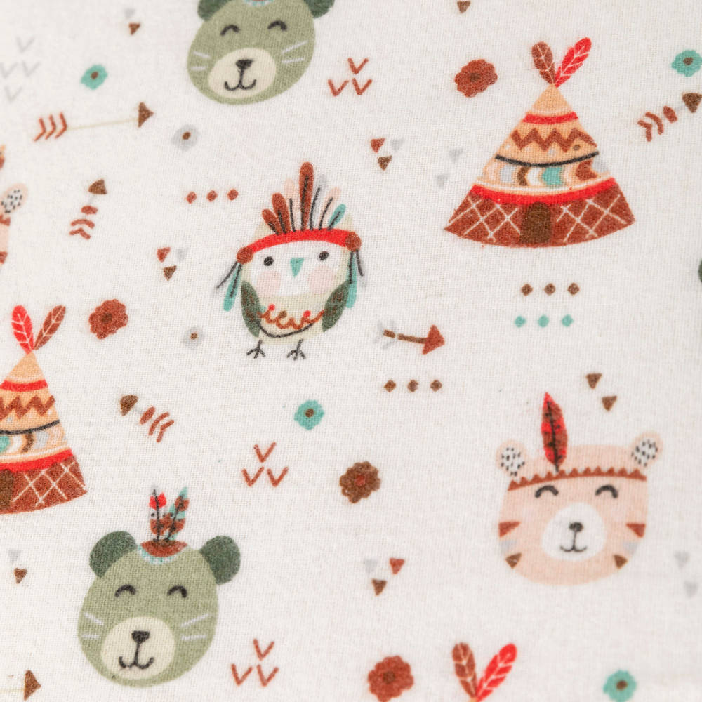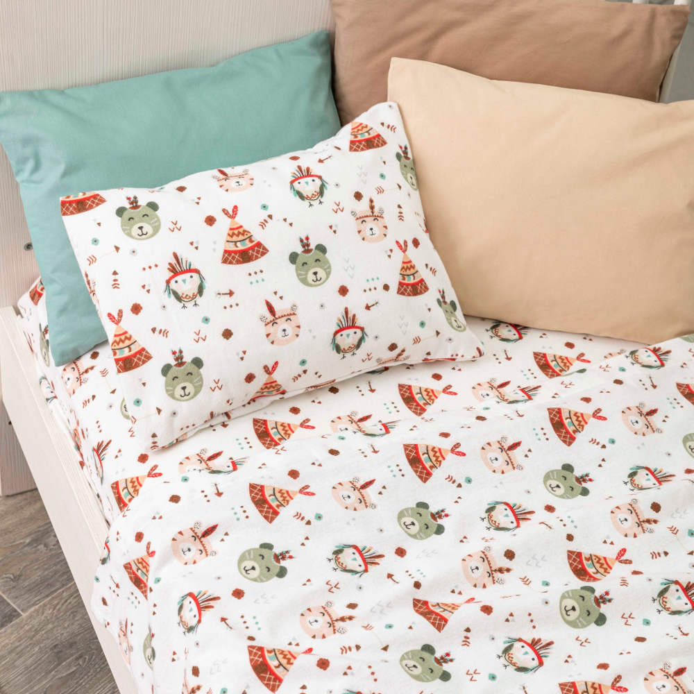 Σετ σεντόνια κούνιας με μαξιλαροθήκη από ύφασμα φανέλα, 100% βαμβακερό, εμπριμέ, χρώμα βεραμάν σε λευκό φόντο, σχέδιο αρκουδάκια, ινδιάνοι.