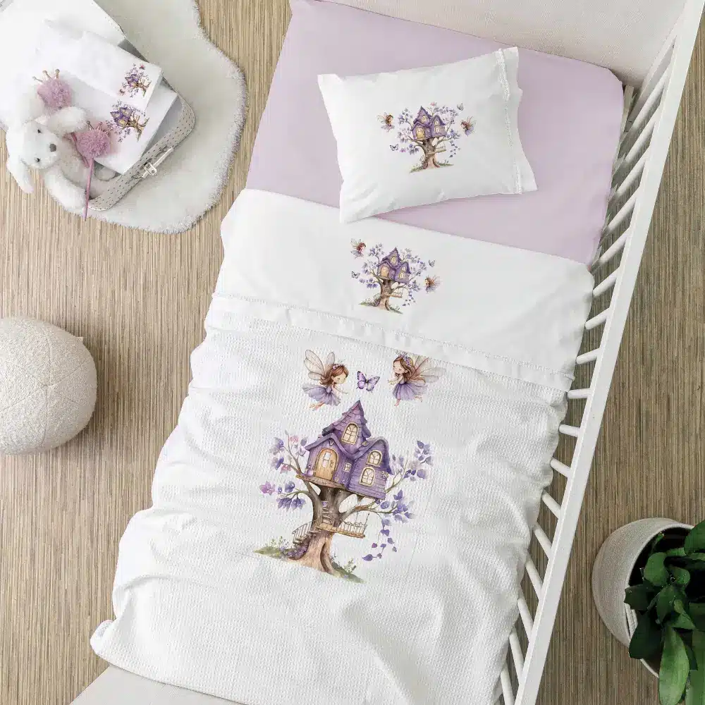 Σετ σεντόνια κούνιας με μαξιλαροθήκη από ύφασμα μερσεριζέ, 160 κλωστών, 100% βαμβακερό, μονόχρωμο, σε χρώμα λευκό, με διακοσμητική δαντέλα και ψηφιακή εκτύπωση στο πανωσέντονο και στη μαξιλαροθήκη, σχέδιο μαγικός κήπος.