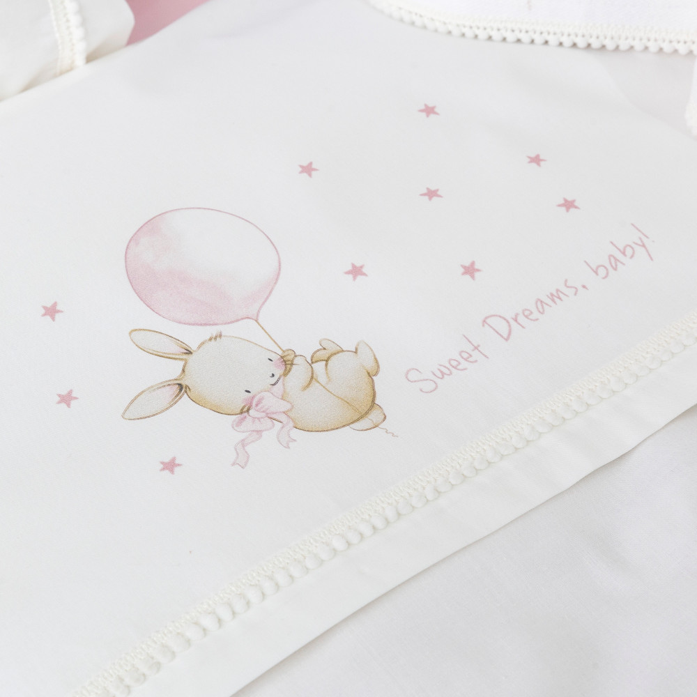 Σετ σεντόνια κούνιας με μαξιλαροθήκη από ύφασμα μερσεριζέ, 160 κλωστών, 100% βαμβακερό, μονόχρωμο, σε χρώμα λευκό-ροζ, με διακοσμητική δαντέλα και ψηφιακή εκτύπωση στο πανωσέντονο και στη μαξιλαροθήκη, σχέδιο sweet dreams baby.Διατίθεται σε 2 χρώματα.
