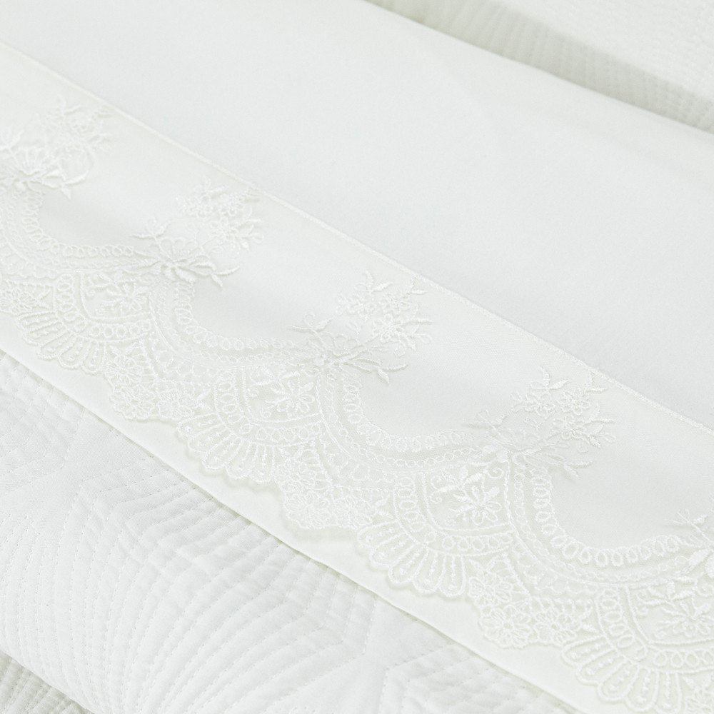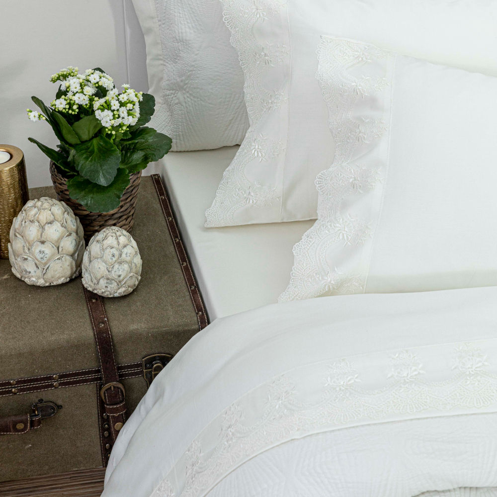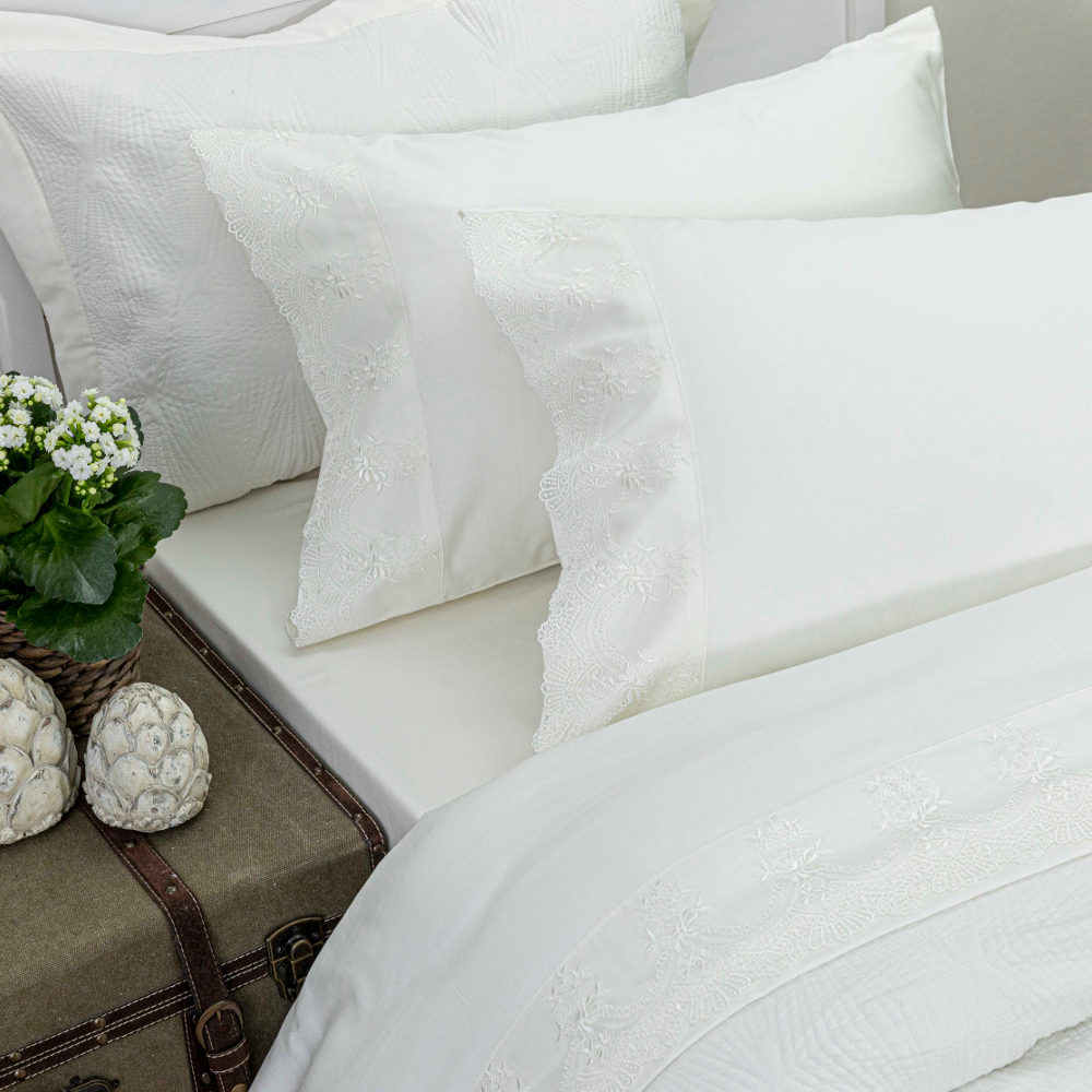 Σετ σεντόνια υπέρδιπλα με μαξιλαροθήκες από ύφασμα βαμβακοσατέν, 205 κλωστών, 100% βαμβακερό, μονόχρωμο, σε χρώμα εκρού, με διακοσμητική κιπούρ δαντέλα στο πανωσέντονο και στις μαξιλαροθήκες.