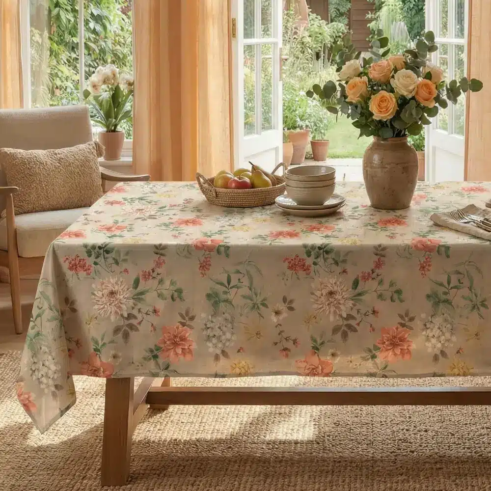 Τραπεζομάντηλο από ύφασμα λονέτα 50% βαμβακερό-50% πολυέστερ, εμπριμέ, σχέδιο με λουλούδια.Διατίθεται σε 4 διαστάσεις.