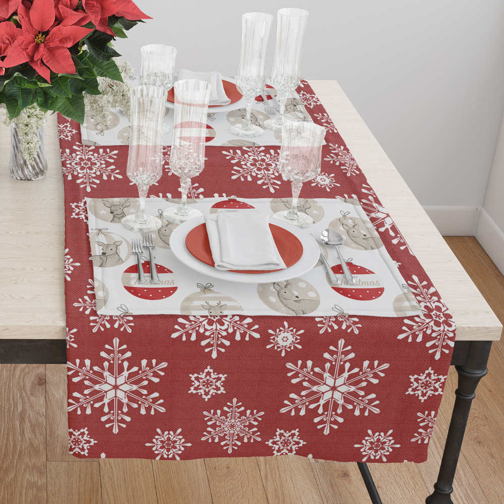 Τραβέρσα από ύφασμα λονέτα 50% βαμβακερό-50% πολυέστερ, με εμπριμέ χριστουγεννιάτικο σχέδιο.
